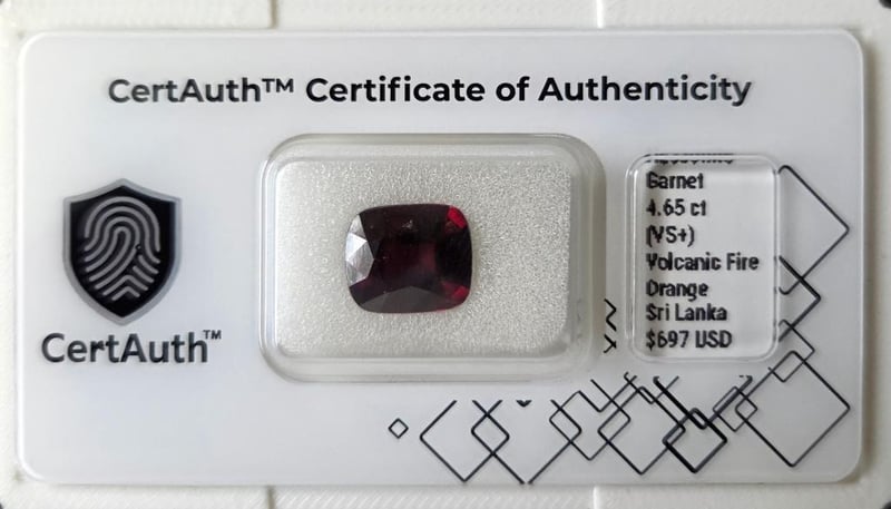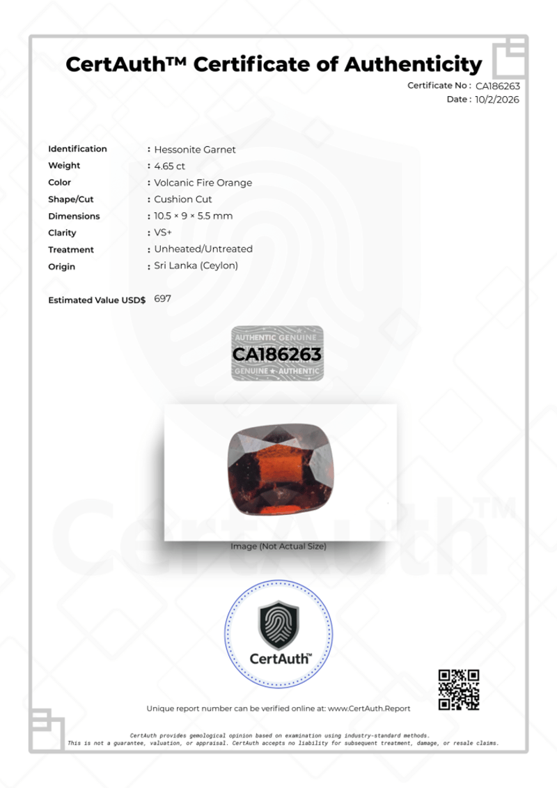 This Natural Hessonite Garnet Displays A Rich Volcanic Fire Orange Colour And Is Fashioned In A Cushion Cut. Weighing An Impressive 4.65 Carats With Vs+ Clarity, This Earth-Mined Gemstone Is Unheated/Untreated And Sourced From Sri Lanka (Ceylon). The Stone Includes A Certauth Digital Certificate For Secure Verification.