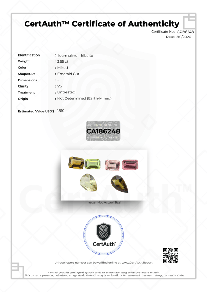 A Striking Natural Elbaite Tourmaline Weighing 3.55 Carats, Displaying Attractive Mixed Colours. Cut In A Classic Emerald Cut, This Untreated Gemstone Offers Excellent Clarity And Vibrant Presence, Suitable For A Bold Statement Ring Or Custom Jewellery Design. Accompanied By A Certauth Digital Certificate For Authentication.