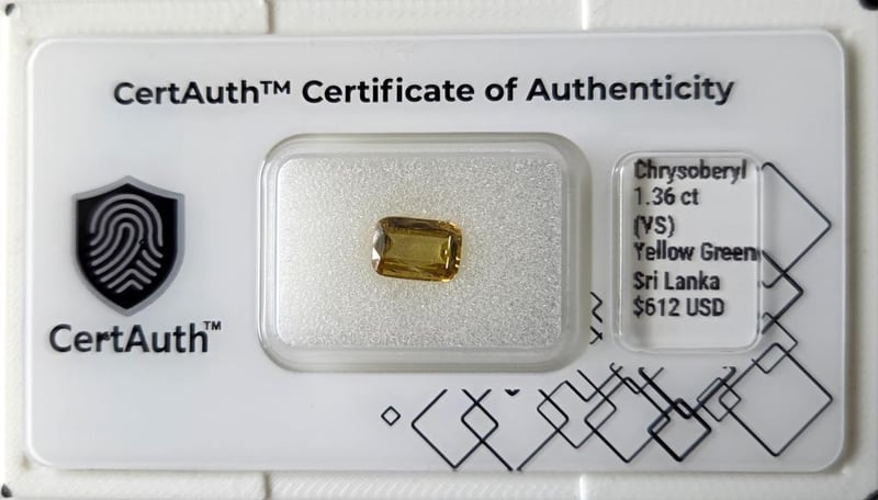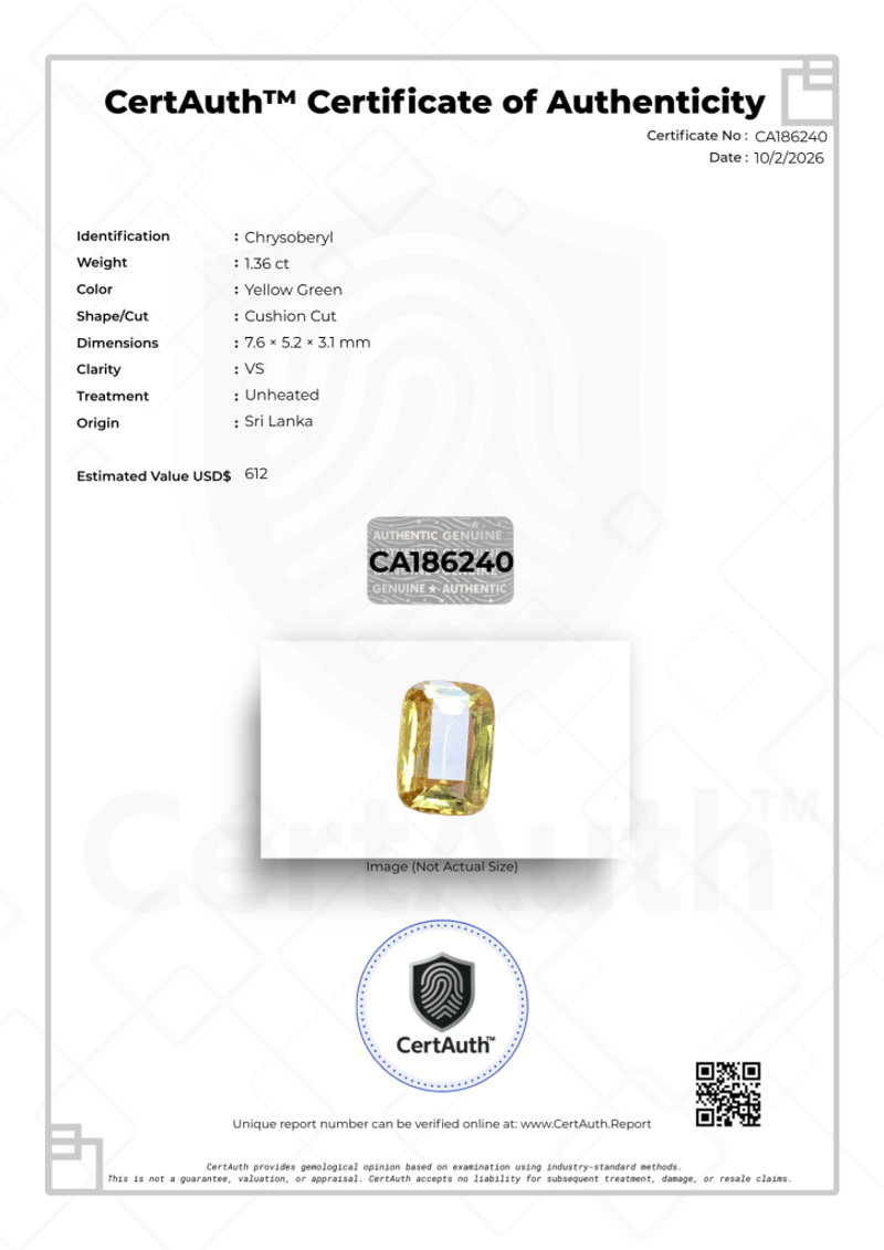 1.36CT YELLOW GREEN CHRYSOBERYL CUSHION CUT – UNHEATED SRI LANKA, CERTIFIED