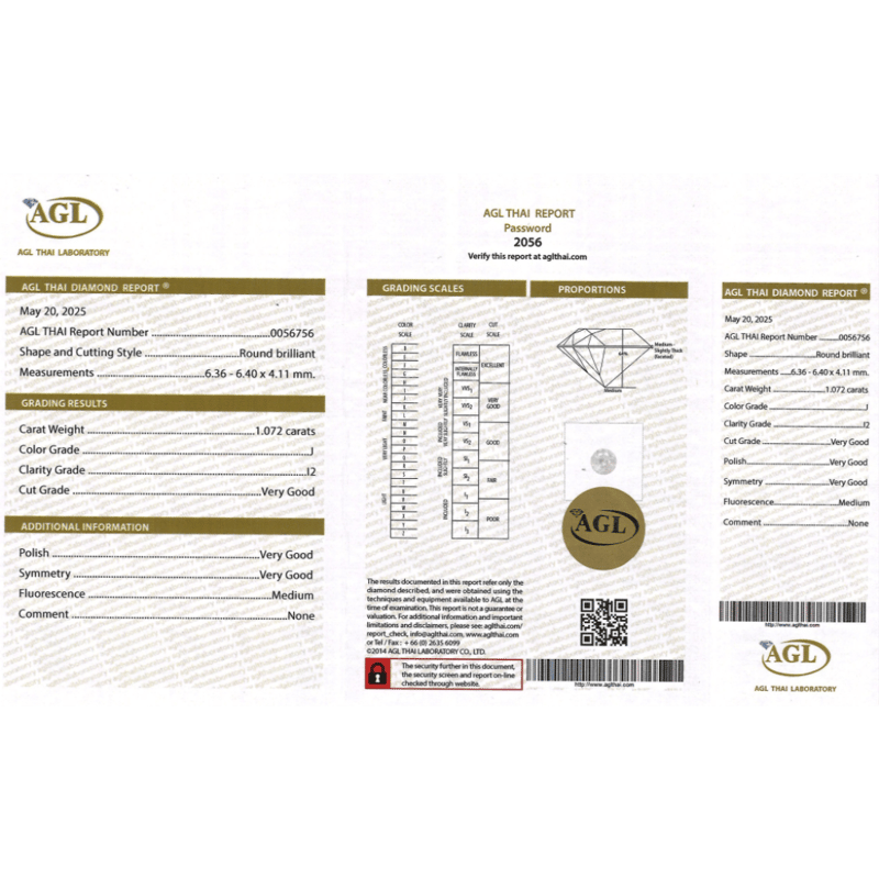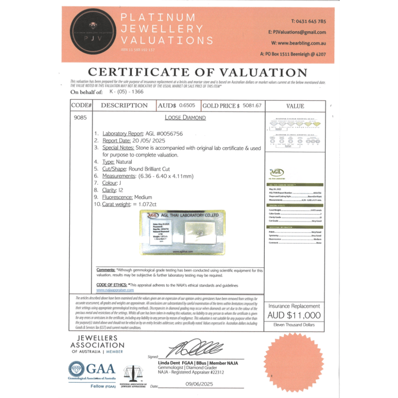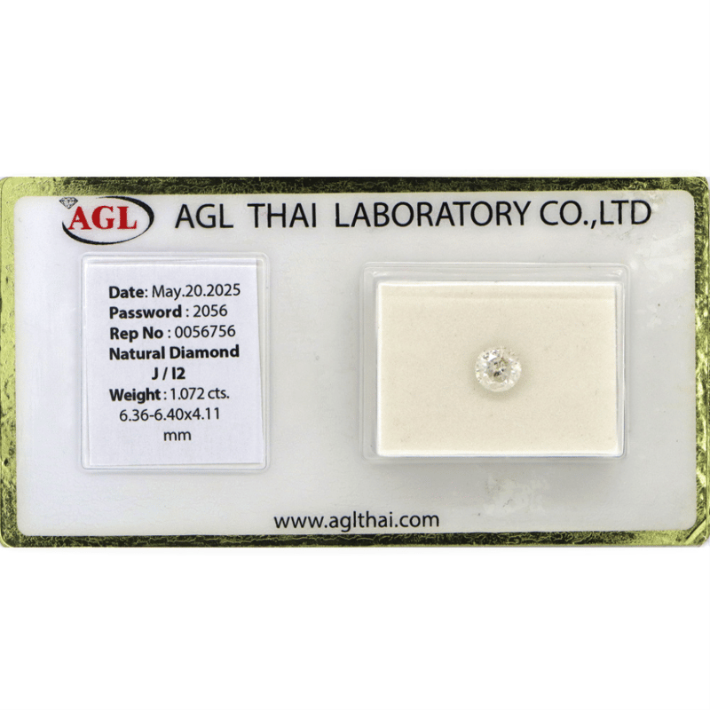 1.072CT CERTIFIED, NATURAL DIAMOND Round Brilliant Cut, J Colour, I2 Clarity, Loose, Unset. Stone Comes Sealed With Agl Report: 0056756. Valuations Provided by an Independent Third-Party Professional Not Directly Associated With Lloyds Auctions at AUD $$11,000.00This valuation has been conducted by an independent third-party professional. The valuation amount is an assessment by the issuing valuer and does not reflect the auction value of the item. Any inquiries regarding the valuation should be directed to the issuing valuer (refer to contact details on the certificate), as Lloyds Auctions has no affiliation or influence over the valuation, the valuer, or the stated amount. Condition: Good - Refer Images 0645946+2105