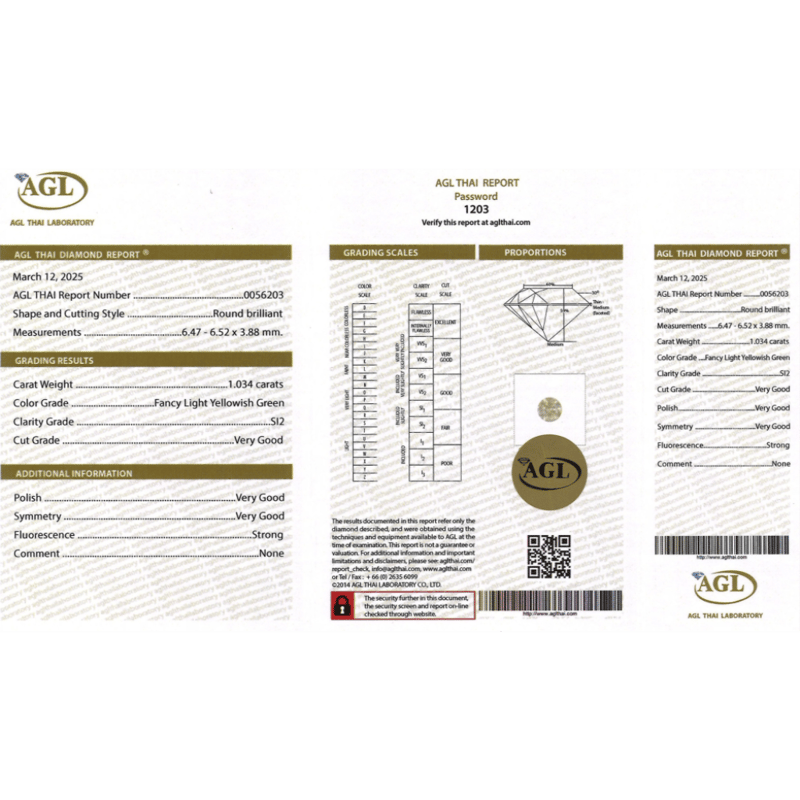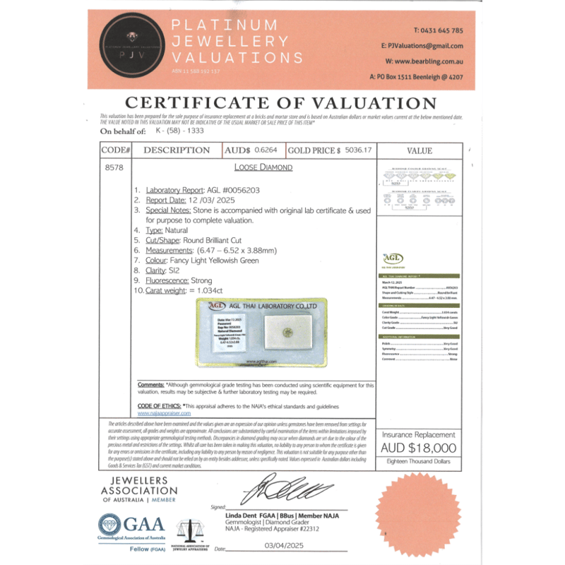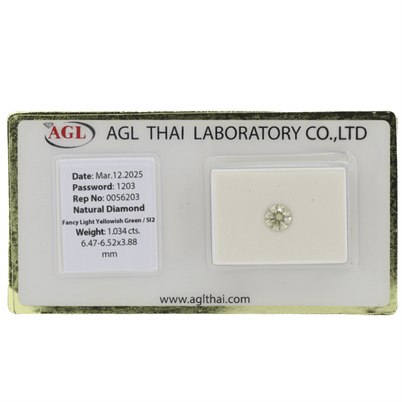 1.034CT CERTIFIED, NATURAL FANCY YELLOW/GREEN DIAMOND Round Brilliant Cut, Light Fancy Yellowish-Green Colour, Si2 Clarity, Loose, Unset. Stone Comes Sealed With Agl Report: 0056203. Valuations Provided by an Independent Third-Party Professional Not Directly Associated With Lloyds Auctions at AUD $$18,000.00This valuation has been conducted by an independent third-party professional. The valuation amount is an assessment by the issuing valuer and does not reflect the auction value of the item. Any inquiries regarding the valuation should be directed to the issuing valuer (refer to contact details on the certificate), as Lloyds Auctions has no affiliation or influence over the valuation, the valuer, or the stated amount. Condition: Good - Refer Images 0645946+2113