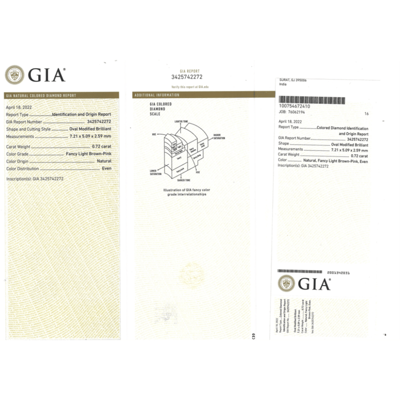 0.72CT CERTIFIED, NATURAL FANCY PINK DIAMOND Oval Modified Brilliant Cut, Fancy Light Brown Pink Colour, Loose, Unset. Stone Comes With Gia Report: 3425842272. Valuations Provided by an Independent Third-Party Professional Not Directly Associated With Lloyds Auctions at AUD $$20,000.00This valuation has been conducted by an independent third-party professional. The valuation amount is an assessment by the issuing valuer and does not reflect the auction value of the item. Any inquiries regarding the valuation should be directed to the issuing valuer (refer to contact details on the certificate), as Lloyds Auctions has no affiliation or influence over the valuation, the valuer, or the stated amount. Condition: Good - Refer Images 0645946+2114