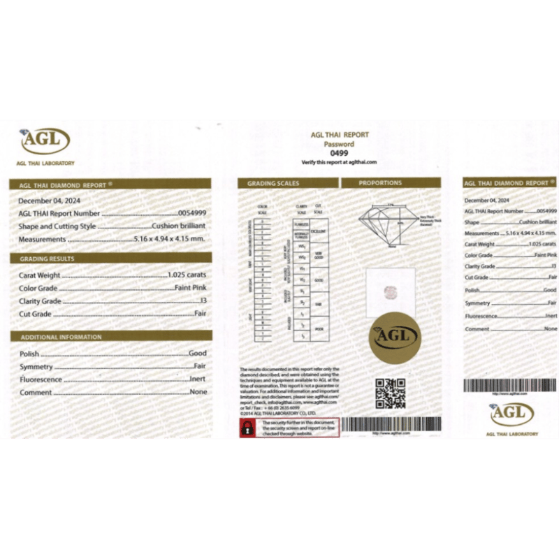 Cushion Brilliant Cut, Faint Pink, I3 Clarity, Loose, Unset. Stone Comes Sealed With Agl Report: 0054999.
