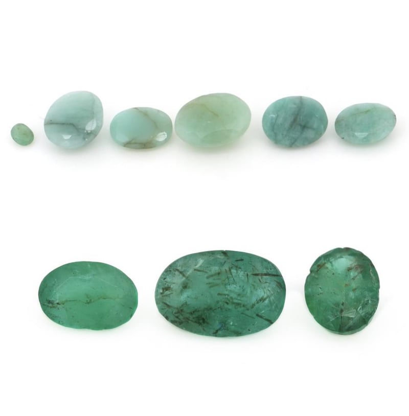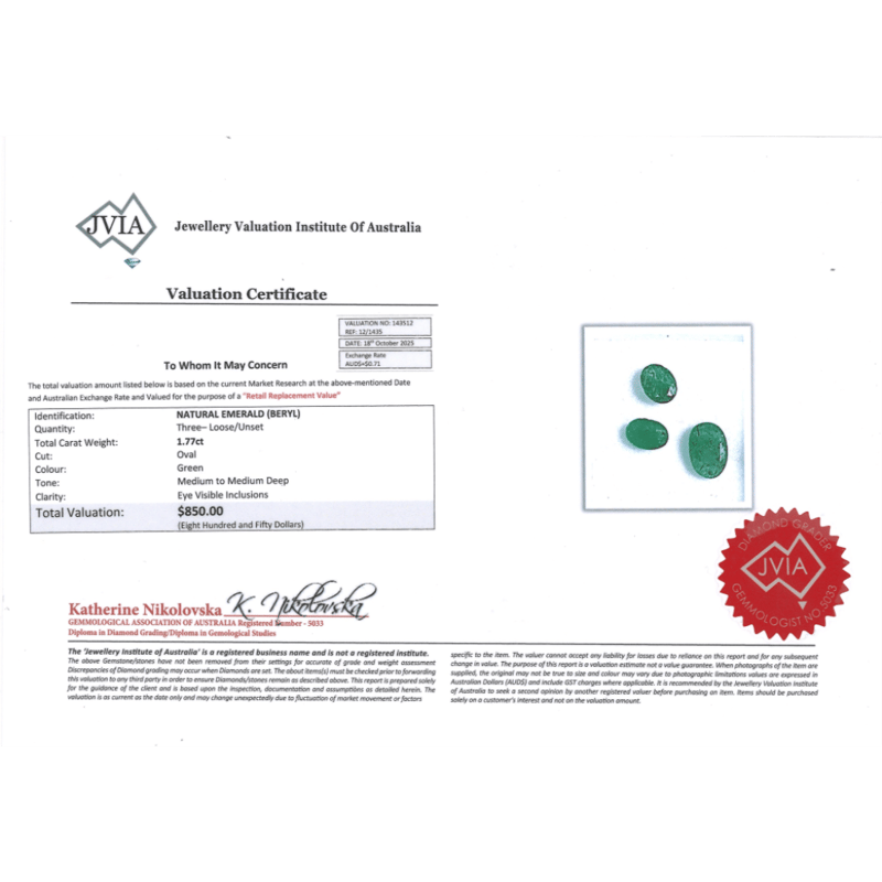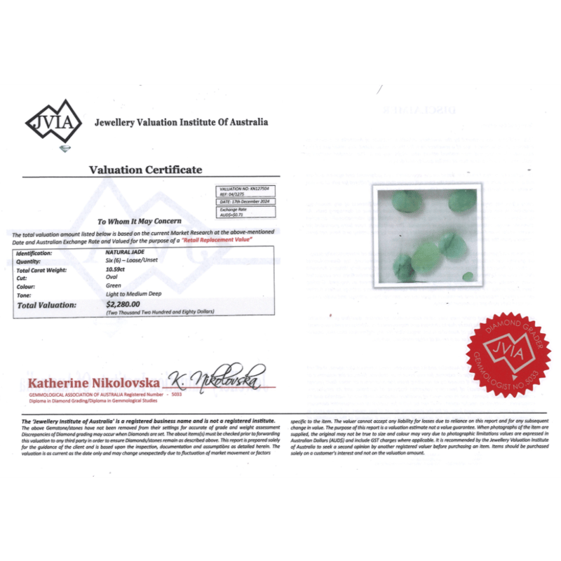 10.59CT TSW X 6, NATURAL JADE AND 1.77CT TSW X 3, NATURAL ZAMBIAN EMERALDS 10.59Ct Tsw X 6, Natural Jade, Oval Cut, Shades Of Light-Medium Deep Green, Opaque, Loose, Unset. 1.77Ct Tsw X 3, Natural Zambian Emeralds, Oval Cut, Medium-Deep Green, Eye Visible Inclusions, Loose, Unset. Valuations Provided by an Independent Third-Party Professional Not Directly Associated With Lloyds Auctions at AUD $3130This valuation has been conducted by an independent third-party professional. The valuation amount is an assessment by the issuing valuer and does not reflect the auction value of the item. Any inquiries regarding the valuation should be directed to the issuing valuer (refer to contact details on the certificate), as Lloyds Auctions has no affiliation or influence over the valuation, the valuer, or the stated amount. Condition: Good - Refer Images 0645946+2129