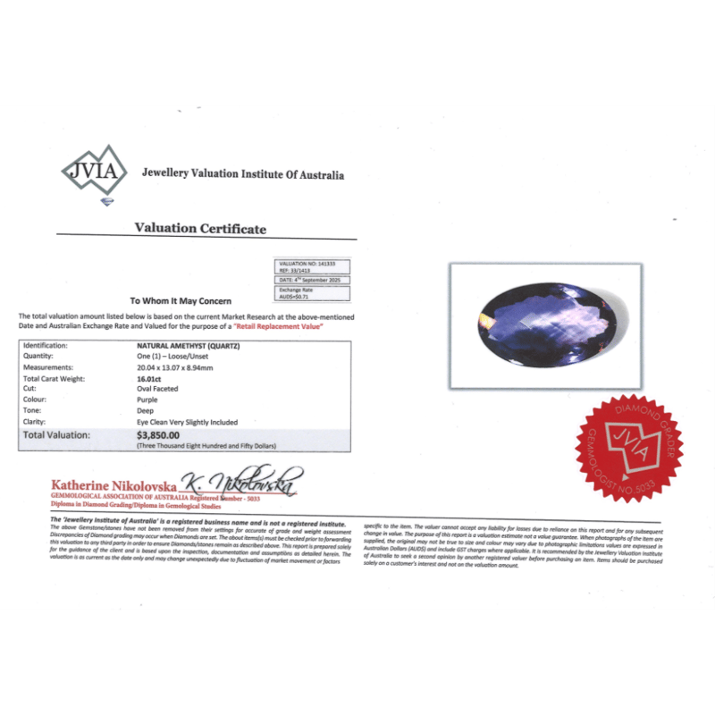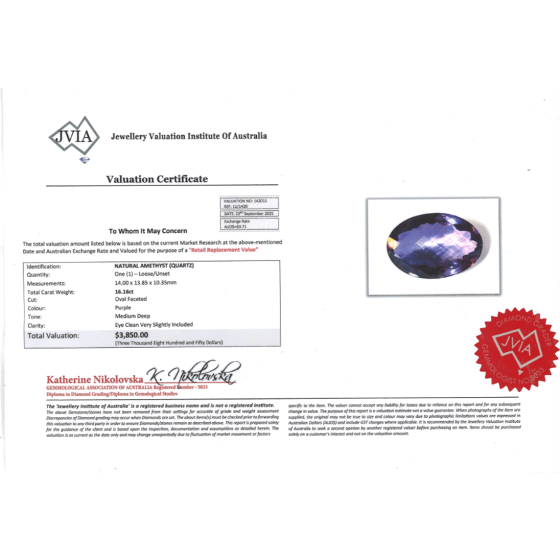 APPROX 32.17CT NATURAL AMETHYST 16.01Ct Natural Amethyst, Oval Faceted Cut, Deep Purple, Eye Clean-Very Slightly Included, Loose, Unset. 16.16Ct Natural Amethyst, Oval Faceted Cut, Medium Deep Purple, Eye Clean/Very Slightly Included, Loose, Unset. Valuations Provided by an Independent Third-Party Professional Not Directly Associated With Lloyds Auctions at AUD $7700This valuation has been conducted by an independent third-party professional. The valuation amount is an assessment by the issuing valuer and does not reflect the auction value of the item. Any inquiries regarding the valuation should be directed to the issuing valuer (refer to contact details on the certificate), as Lloyds Auctions has no affiliation or influence over the valuation, the valuer, or the stated amount. Condition: Good - Refer Images 0645946+2133
