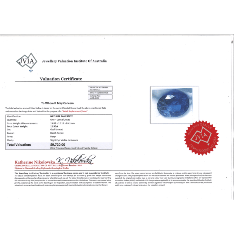 12.50CT NATURAL TANZANITE Oval Faceted Cut, Deep Bluish-Purple, Slight Eye Visible Inclusions, Loose, Unset. Valuations Provided by an Independent Third-Party Professional Not Directly Associated With Lloyds Auctions at AUD $$9,720.00This valuation has been conducted by an independent third-party professional. The valuation amount is an assessment by the issuing valuer and does not reflect the auction value of the item. Any inquiries regarding the valuation should be directed to the issuing valuer (refer to contact details on the certificate), as Lloyds Auctions has no affiliation or influence over the valuation, the valuer, or the stated amount. Condition: Good - Refer Images 0645946+2135