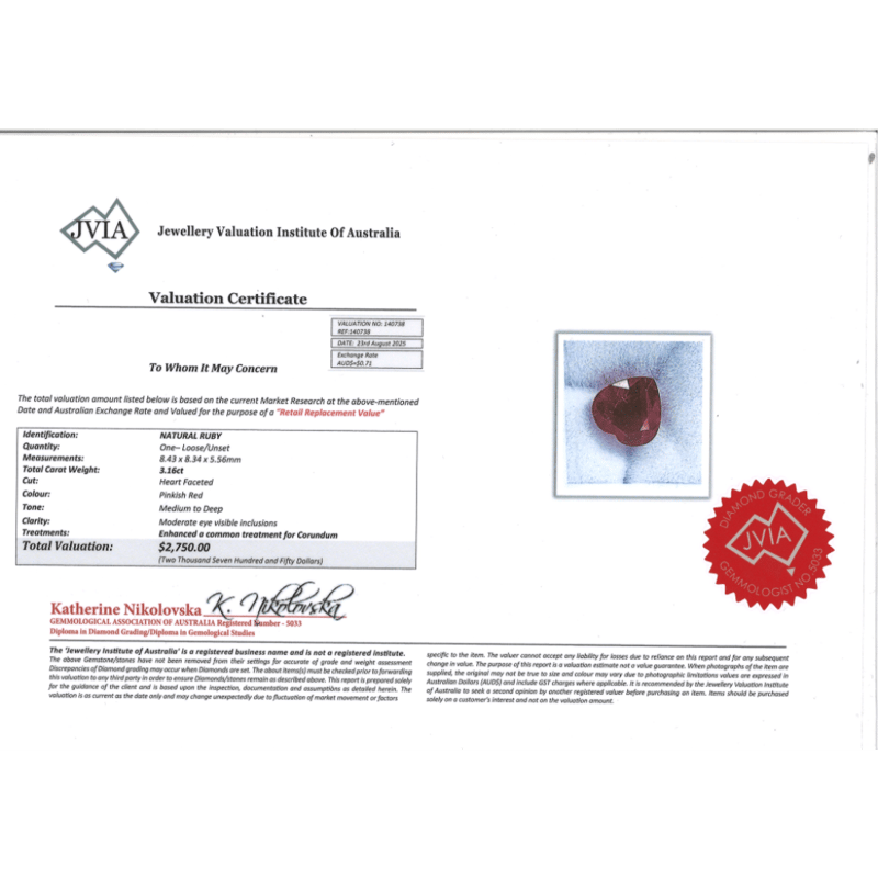 3.16CT, NATURAL RUBY Heart Faceted Cut, Medium-Deep Pinkish-Red, Moderate Eye Visible Inclusions, Loose, Unset. Valuations Provided by an Independent Third-Party Professional Not Directly Associated With Lloyds Auctions at AUD $$2,750.00This valuation has been conducted by an independent third-party professional. The valuation amount is an assessment by the issuing valuer and does not reflect the auction value of the item. Any inquiries regarding the valuation should be directed to the issuing valuer (refer to contact details on the certificate), as Lloyds Auctions has no affiliation or influence over the valuation, the valuer, or the stated amount. Condition: Good - Refer Images 0645946+2143