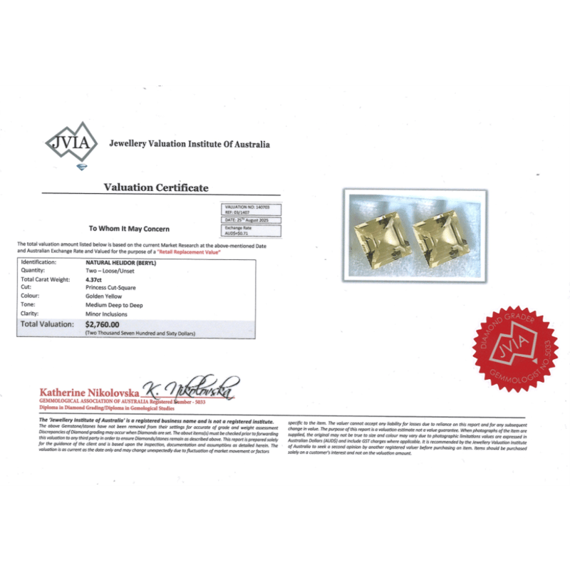 4.37CT TSW X 2, NATURAL BERYL HELIODOR Princess Cut, Medium-Deep Golden Yellow, Minor Inclusions, Loose, Unset. Valuations Provided by an Independent Third-Party Professional Not Directly Associated With Lloyds Auctions at AUD $$2,760.00This valuation has been conducted by an independent third-party professional. The valuation amount is an assessment by the issuing valuer and does not reflect the auction value of the item. Any inquiries regarding the valuation should be directed to the issuing valuer (refer to contact details on the certificate), as Lloyds Auctions has no affiliation or influence over the valuation, the valuer, or the stated amount. Condition: Good - Refer Images 0645946+2147