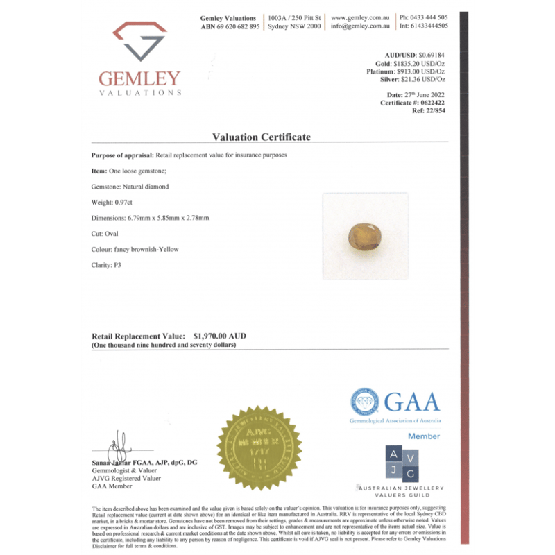 0.97CT NATURAL FANCY YELLOW DIAMOND Oval Cut, Fancy Brownish-Yellow, P3 Clarity, Loose, Unset. Valuations Provided by an Independent Third-Party Professional Not Directly Associated With Lloyds Auctions at AUD $$1,970.00This valuation has been conducted by an independent third-party professional. The valuation amount is an assessment by the issuing valuer and does not reflect the auction value of the item. Any inquiries regarding the valuation should be directed to the issuing valuer (refer to contact details on the certificate), as Lloyds Auctions has no affiliation or influence over the valuation, the valuer, or the stated amount. 0645946+2158