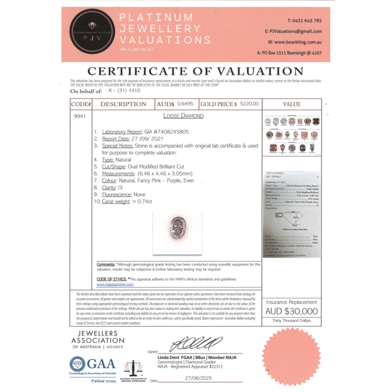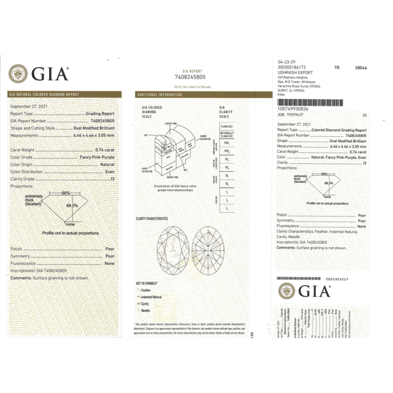 Oval Modified Brilliant Cut, Fancy Pink/Purple Colour, I3 Clarity, Loose, Unset. Stone Comes With Gia Report: 7408245805.