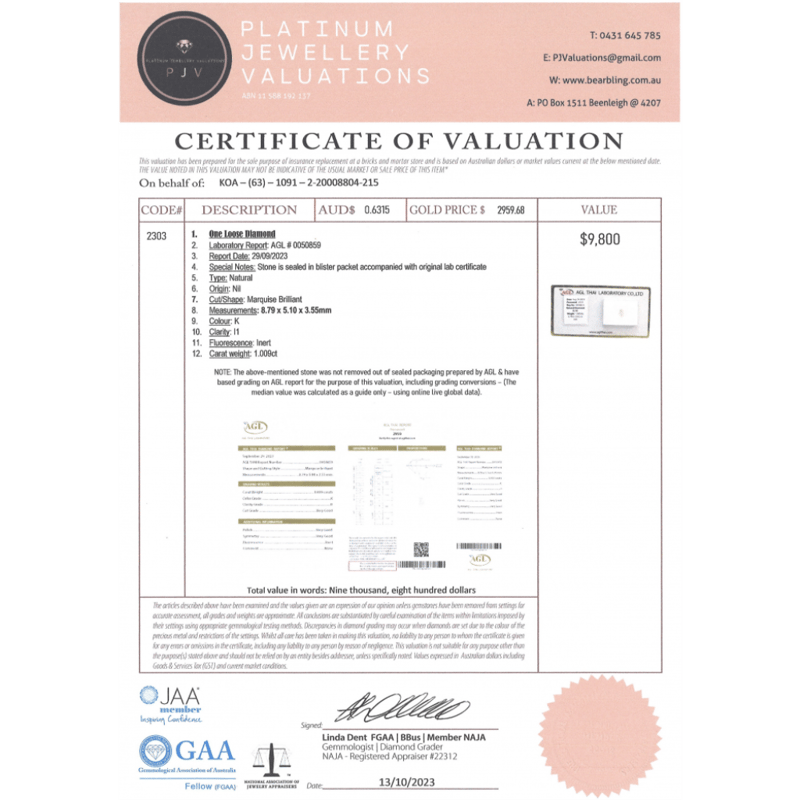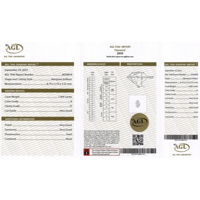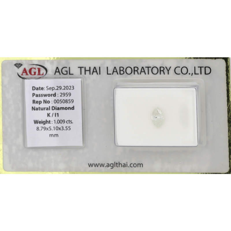 Marquise Brilliant Cut, K Colour, I1 Clarity, Loose, Unset. Stone Comes Sealed With Agl Report: 0050859.