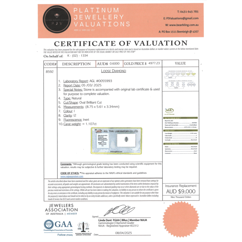 1.107CT CERTIFIED, NATURAL DIAMOND Oval Brilliant Cut, I Colour, I2 Clarity, Loose, Unset. Stone Comes Sealed With Agl Report: 0055993. Valuations Provided by an Independent Third-Party Professional Not Directly Associated With Lloyds Auctions at AUD $$9,000.00This valuation has been conducted by an independent third-party professional. The valuation amount is an assessment by the issuing valuer and does not reflect the auction value of the item. Any inquiries regarding the valuation should be directed to the issuing valuer (refer to contact details on the certificate), as Lloyds Auctions has no affiliation or influence over the valuation, the valuer, or the stated amount. 0645946+2163