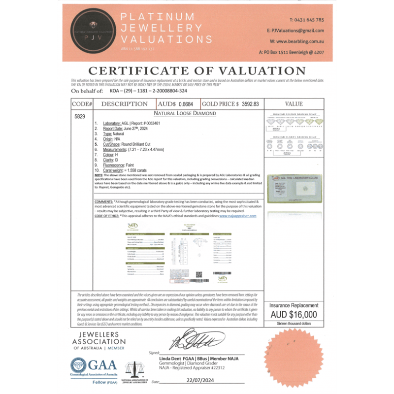1.558CT CERTIFIED, NATURAL DIAMOND
