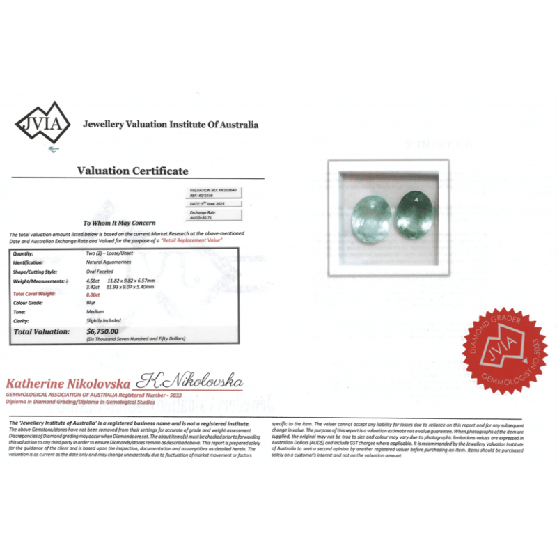 8.00CT TSW X 2, NATURAL AQUAMARINES Oval Faceted Cut, Medium Blue, Slightly Included, Loose, Unset. Valuations Provided by an Independent Third-Party Professional Not Directly Associated With Lloyds Auctions at AUD $$6,750.00This valuation has been conducted by an independent third-party professional. The valuation amount is an assessment by the issuing valuer and does not reflect the auction value of the item. Any inquiries regarding the valuation should be directed to the issuing valuer (refer to contact details on the certificate), as Lloyds Auctions has no affiliation or influence over the valuation, the valuer, or the stated amount. Condition: Good - Refer Images 0645946+2172