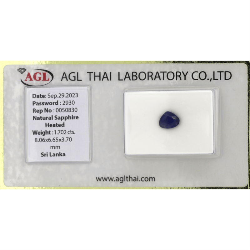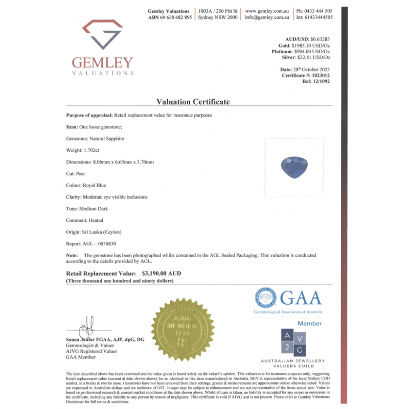 1.702CT CERTIFIED, NATURAL BLUE CEYLON SAPPHIRE Pear Cut, Medium Dark Royal Blue, Moderate Eye Visible Inclusions, Heat Enhanced, Sri Lanka (Ceylon) Origin, Loose, Unset. Stone Comes Sealed With Agl Report: 0050830. Valuations Provided by an Independent Third-Party Professional Not Directly Associated With Lloyds Auctions at AUD $$3,190.00This valuation has been conducted by an independent third-party professional. The valuation amount is an assessment by the issuing valuer and does not reflect the auction value of the item. Any inquiries regarding the valuation should be directed to the issuing valuer (refer to contact details on the certificate), as Lloyds Auctions has no affiliation or influence over the valuation, the valuer, or the stated amount. Condition: Good - Refer Images 0645950+2218