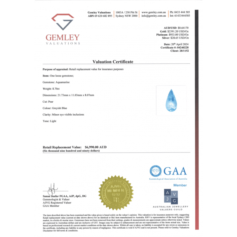 8.70CT NATURAL BERYL AQUAMARINE Pear Cut, Light Greyish-Blue, Minor Eye Visible Inclusions, Loose, Unset. Valuations Provided by an Independent Third-Party Professional Not Directly Associated With Lloyds Auctions at AUD $$6,990.00This valuation has been conducted by an independent third-party professional. The valuation amount is an assessment by the issuing valuer and does not reflect the auction value of the item. Any inquiries regarding the valuation should be directed to the issuing valuer (refer to contact details on the certificate), as Lloyds Auctions has no affiliation or influence over the valuation, the valuer, or the stated amount. Condition: Good - Refer Images 0645950+2219