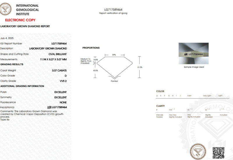 3.07CT D VVS2 OVAL CUT DIAMOND - IDEALLY PROPORTIONED Dimensions: 11.94 x 8.27 x 5.07mms Ideally Proportioned, Igi Certified Lab Grown Diamond. 100% Eye Clean. An Exceptional Diamond For Discerning Buyers. Brand New. 0 163112+1 CROSSDOCK