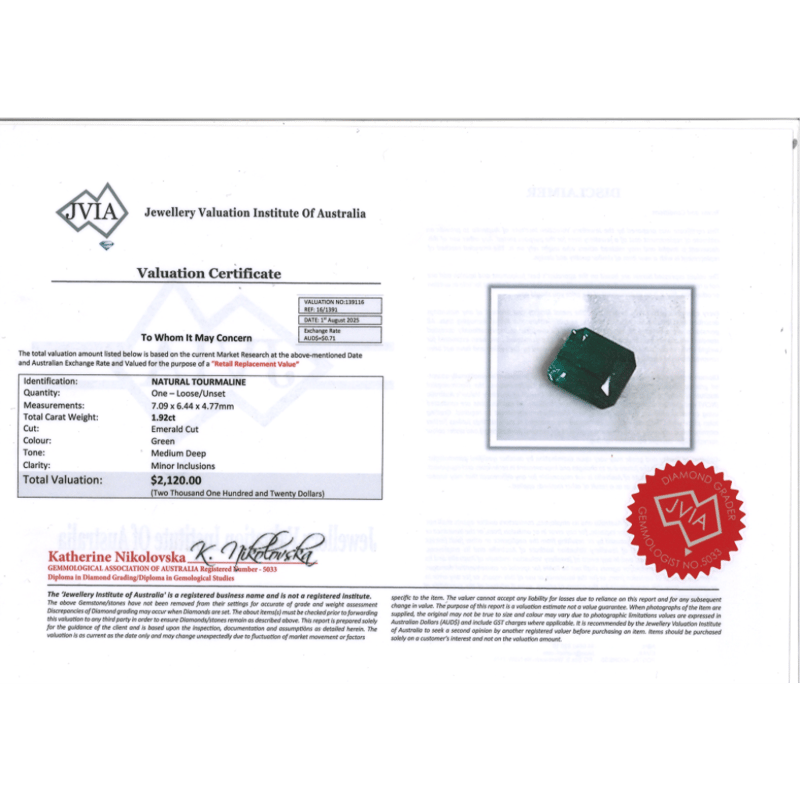 1.92CT, NATURAL TOURMALINE Emerald Cut, Medium Deep Green, Minor Inclusions, Loose, Unset. Valuations Provided by an Independent Third-Party Professional Not Directly Associated With Lloyds Auctions at AUD $$2,120.00This valuation has been conducted by an independent third-party professional. The valuation amount is an assessment by the issuing valuer and does not reflect the auction value of the item. Any inquiries regarding the valuation should be directed to the issuing valuer (refer to contact details on the certificate), as Lloyds Auctions has no affiliation or influence over the valuation, the valuer, or the stated amount. Condition: Good - Refer Images 0645954+2310
