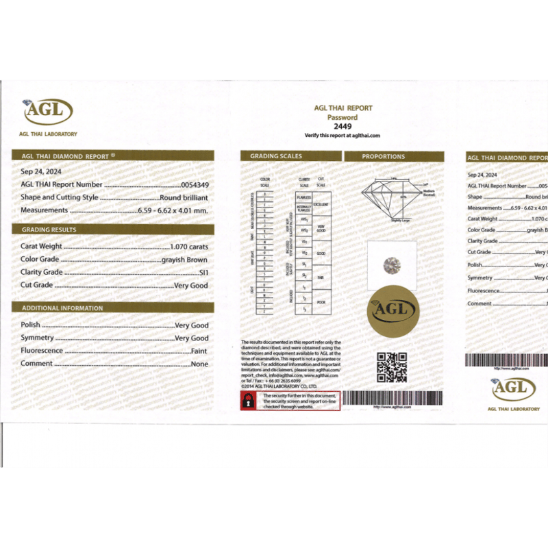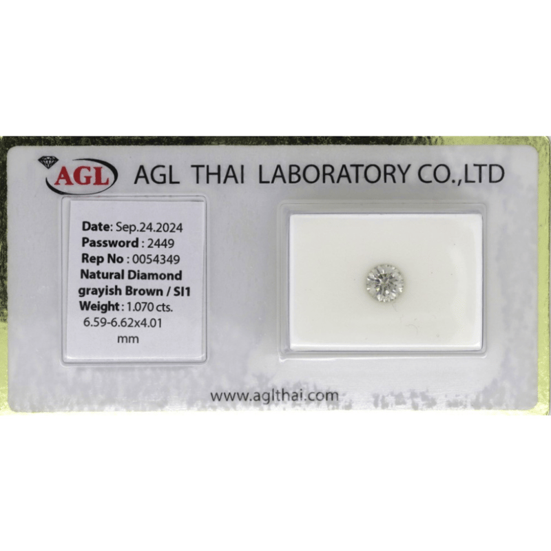 1.070CT CERTIFIED, NATURAL BROWN DIAMOND Round Brilliant Cut, Greyish-Brown, Si1 Clarity, Loose, Unset. Stone Comes Sealed With Agl Report: 0054349. Valuations Provided by an Independent Third-Party Professional Not Directly Associated With Lloyds Auctions at AUD $$16,000.00This valuation has been conducted by an independent third-party professional. The valuation amount is an assessment by the issuing valuer and does not reflect the auction value of the item. Any inquiries regarding the valuation should be directed to the issuing valuer (refer to contact details on the certificate), as Lloyds Auctions has no affiliation or influence over the valuation, the valuer, or the stated amount. Condition: Good - Refer Images 0645954+2329