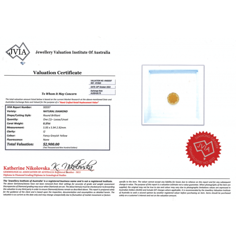 Round Brilliant Cut, Fancy Greyish-Yellow, I2 Clarity, Loose, Unset.