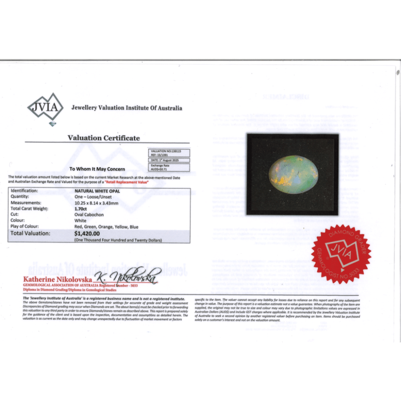 1.70CT, NATURAL WHITE OPAL Oval Cabochon Cut, Orange, Yellow, Green, Blue, Red Colour Play, Loose Unset. Valuations Provided by an Independent Third-Party Professional Not Directly Associated With Lloyds Auctions at AUD $$1,420.00This valuation has been conducted by an independent third-party professional. The valuation amount is an assessment by the issuing valuer and does not reflect the auction value of the item. Any inquiries regarding the valuation should be directed to the issuing valuer (refer to contact details on the certificate), as Lloyds Auctions has no affiliation or influence over the valuation, the valuer, or the stated amount. Condition: Good - Refer Images 0645954+2335