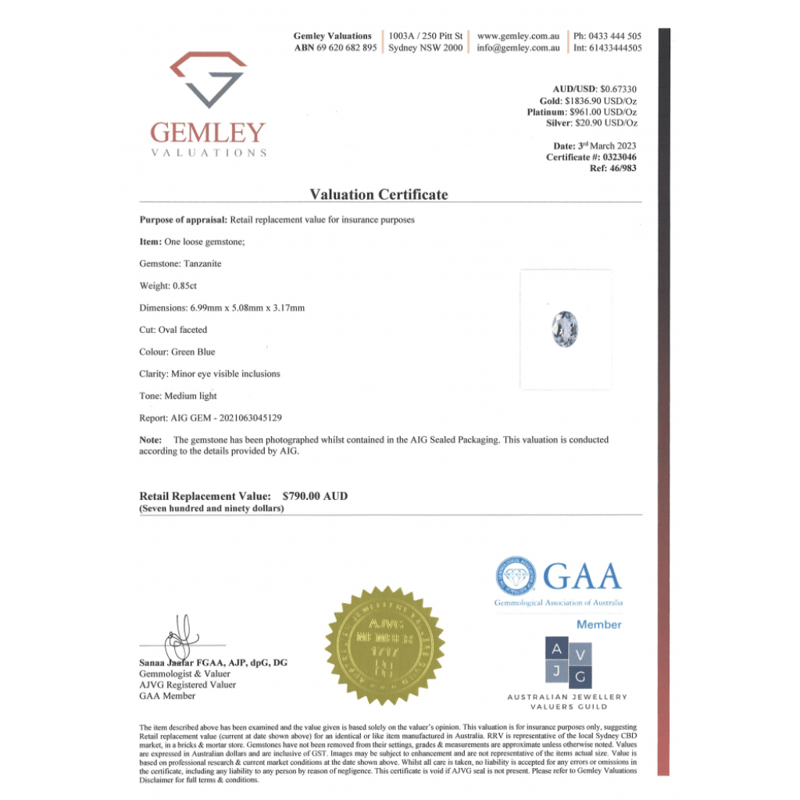 0.85CT CERTIFIED, NATURAL TANZANITE