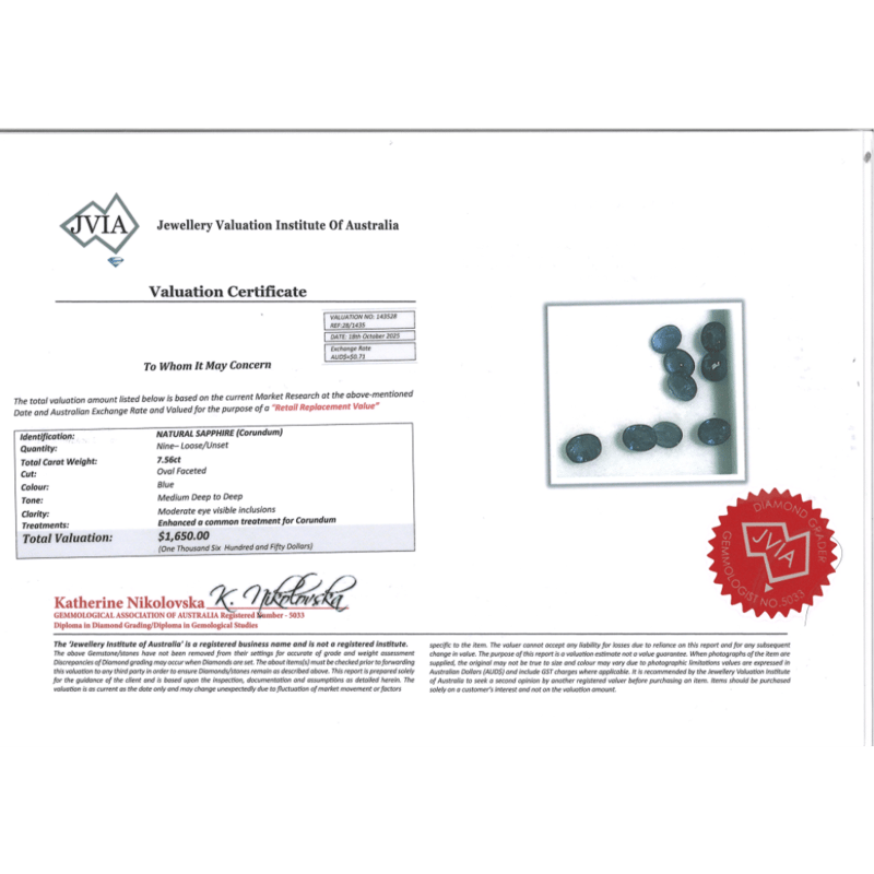 7.56CT TSW X 9, NATURAL BLUE CORUNDUM SAPPHIRES Oval Faceted Cut, Blue, Moderate Eye Visible Inclusions, Enhanced, Loose, Unset. Valuations Provided by an Independent Third-Party Professional Not Directly Associated With Lloyds Auctions at AUD $$1,650.00This valuation has been conducted by an independent third-party professional. The valuation amount is an assessment by the issuing valuer and does not reflect the auction value of the item. Any inquiries regarding the valuation should be directed to the issuing valuer (refer to contact details on the certificate), as Lloyds Auctions has no affiliation or influence over the valuation, the valuer, or the stated amount. Condition: Good - Refer Images 0645954+2341