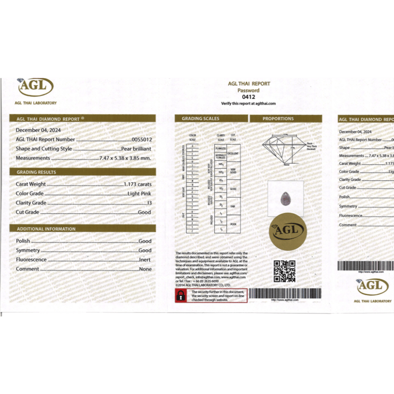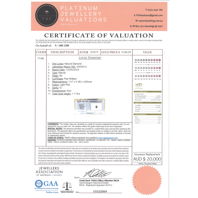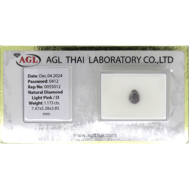 Pear Brilliant Cut, Faint Pink Colour, I3 Clarity, Loose, Unset. Stone Comes Sealed With Agl Report: 0055012.