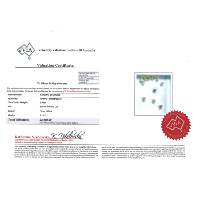 1.03CT TDW X 12, NATURAL FANCY YELLOW DIAMONDS Round Brilliant, Fancy Yellow, Si1-P1 Clarity, Loose, Unset. Valuations Provided by an Independent Third-Party Professional Not Directly Associated With Lloyds Auctions at AUD $$2,480.00This valuation has been conducted by an independent third-party professional. The valuation amount is an assessment by the issuing valuer and does not reflect the auction value of the item. Any inquiries regarding the valuation should be directed to the issuing valuer (refer to contact details on the certificate), as Lloyds Auctions has no affiliation or influence over the valuation, the valuer, or the stated amount. Condition: Good - Refer Images 0645954+2351