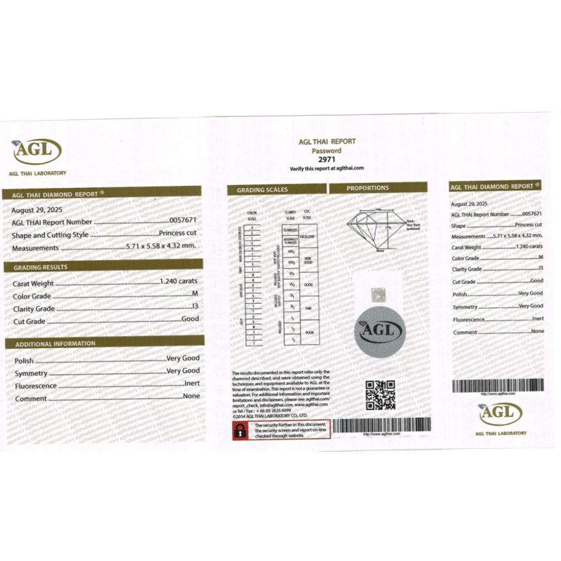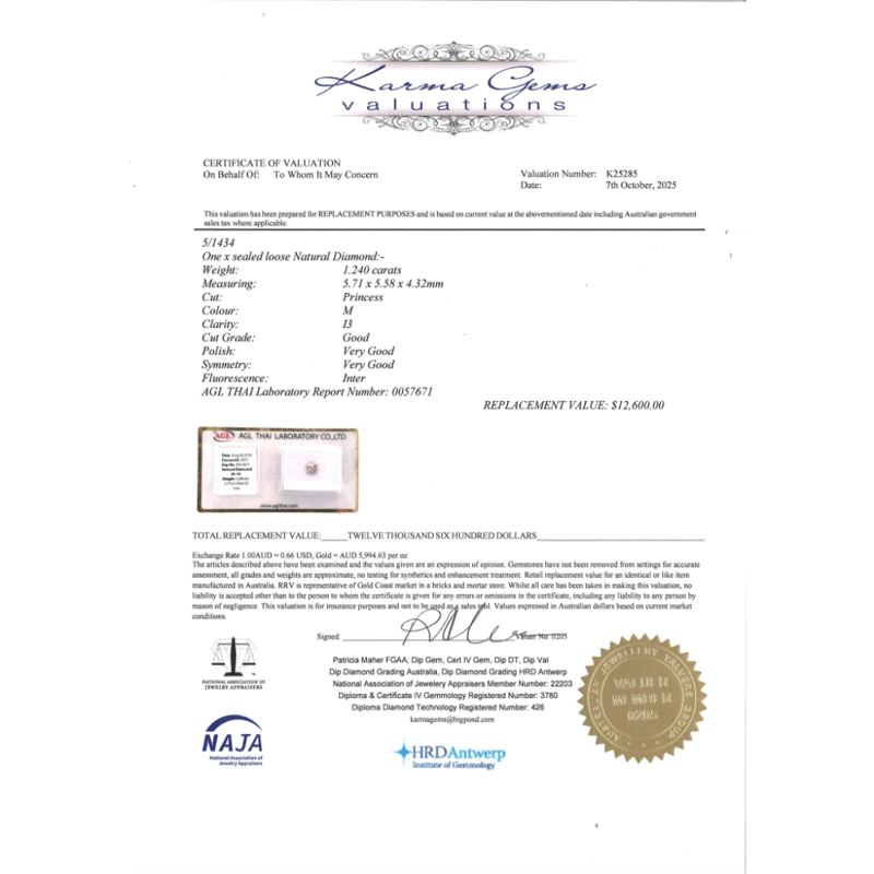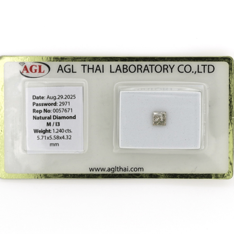 1.24CT CERTIFIED, NATURAL DIAMOND Princess Cut, M Colour, I3 Clarity, Loose, Unset. Stone Comes Sealed With Agl Report: 0057671. Valuations Provided by an Independent Third-Party Professional Not Directly Associated With Lloyds Auctions at AUD $$12,600.00This valuation has been conducted by an independent third-party professional. The valuation amount is an assessment by the issuing valuer and does not reflect the auction value of the item. Any inquiries regarding the valuation should be directed to the issuing valuer (refer to contact details on the certificate), as Lloyds Auctions has no affiliation or influence over the valuation, the valuer, or the stated amount. Condition: Good - Refer Images 0645954+2355