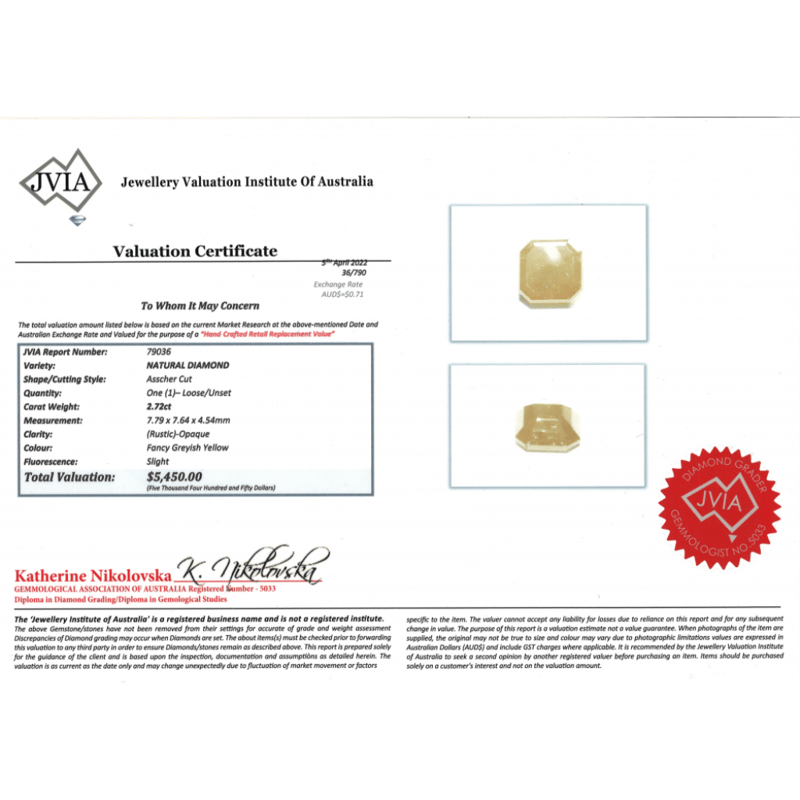 2.72CT NATURAL FANCY YELLOW DIAMOND Asscher Cut, Fancy Greyish-Yellow, Opaque, Loose, Unset. Valuations Provided by an Independent Third-Party Professional Not Directly Associated With Lloyds Auctions at AUD $$5,450.00This valuation has been conducted by an independent third-party professional. The valuation amount is an assessment by the issuing valuer and does not reflect the auction value of the item. Any inquiries regarding the valuation should be directed to the issuing valuer (refer to contact details on the certificate), as Lloyds Auctions has no affiliation or influence over the valuation, the valuer, or the stated amount. Condition: Good - Refer Images 0645954+2357