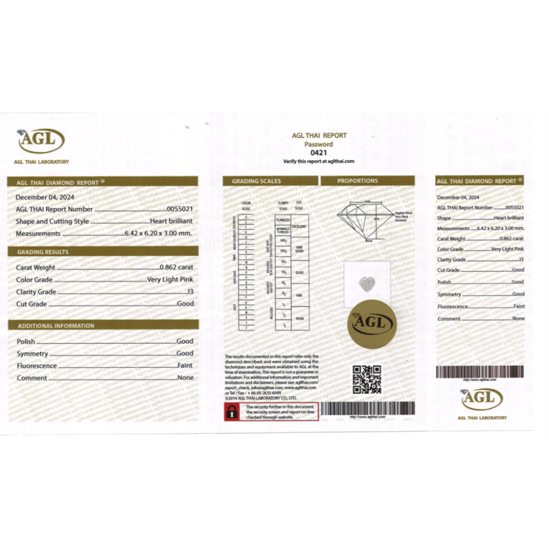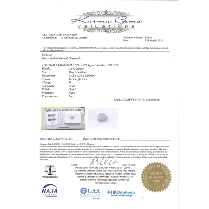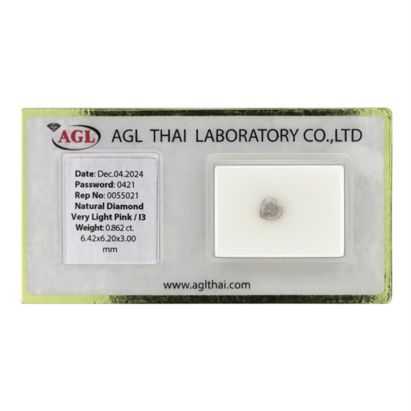 Heart Brilliant Cut, Very Light Pink Colour, I3 Clarity, Loose, Unset. Stone Comes Sealed With Agl Report: 005555021.