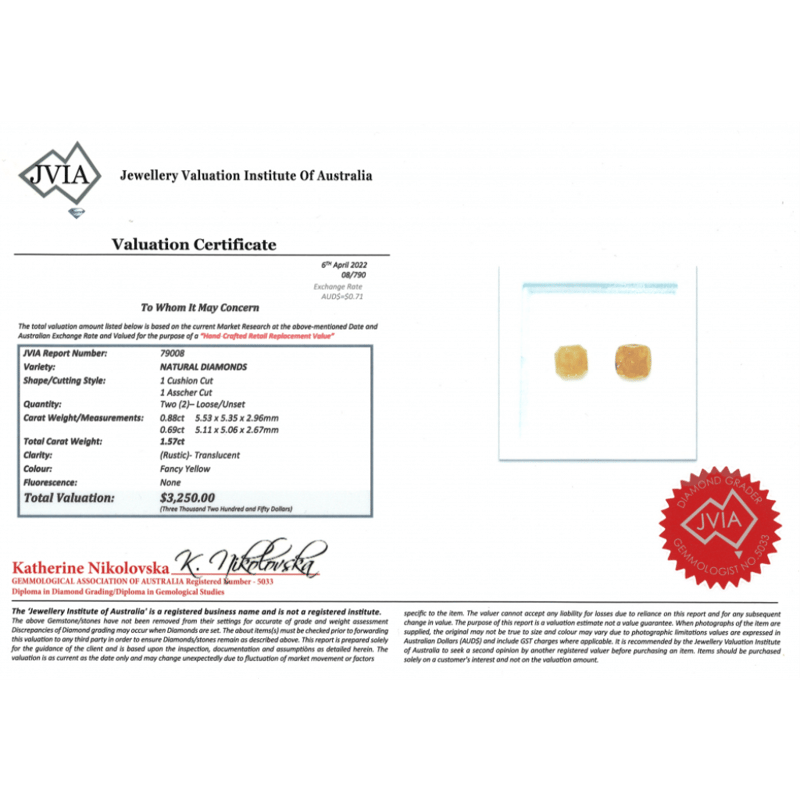 1.57CT TDW X 2, NATURAL FANCY YELLOW DIAMONDS One Asscher Cut, One Cushion Cut, Fancy Yellow, Translucent, Loose, Unset. Valuations Provided by an Independent Third-Party Professional Not Directly Associated With Lloyds Auctions at AUD $$3,250.00This valuation has been conducted by an independent third-party professional. The valuation amount is an assessment by the issuing valuer and does not reflect the auction value of the item. Any inquiries regarding the valuation should be directed to the issuing valuer (refer to contact details on the certificate), as Lloyds Auctions has no affiliation or influence over the valuation, the valuer, or the stated amount. Condition: Good - Refer Images 0645958+2019