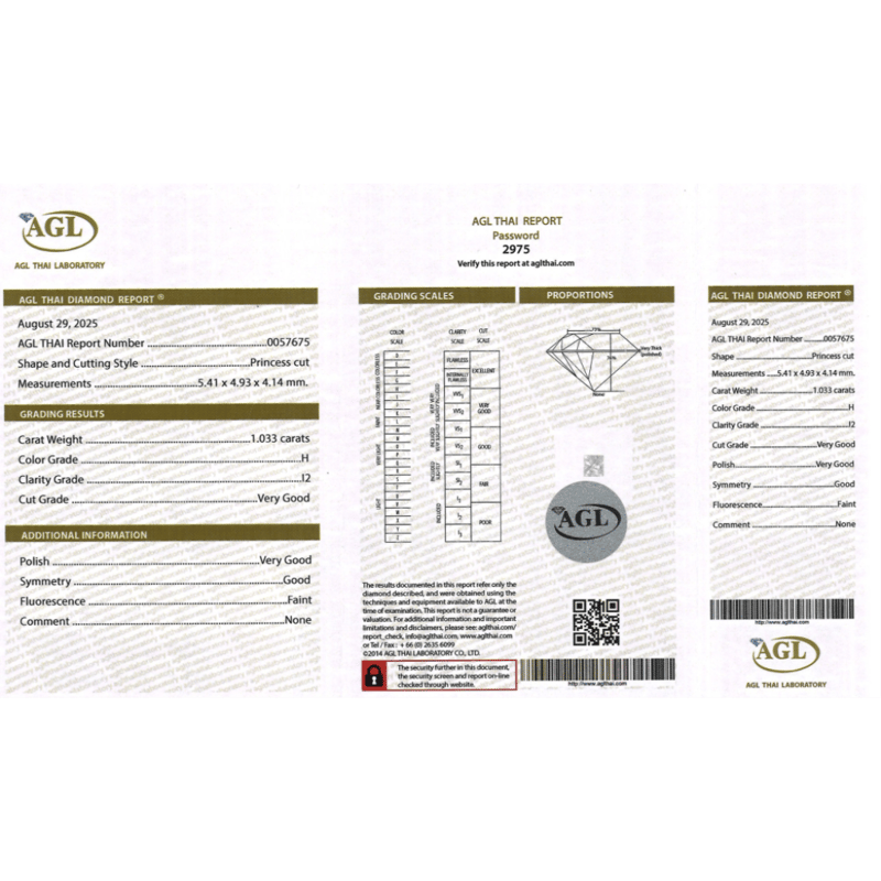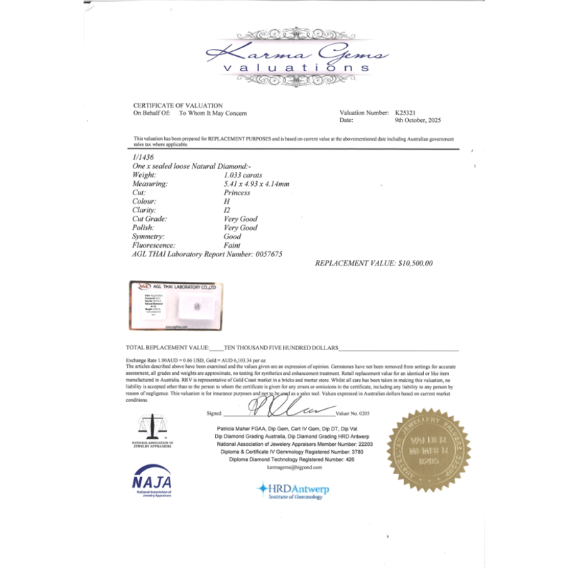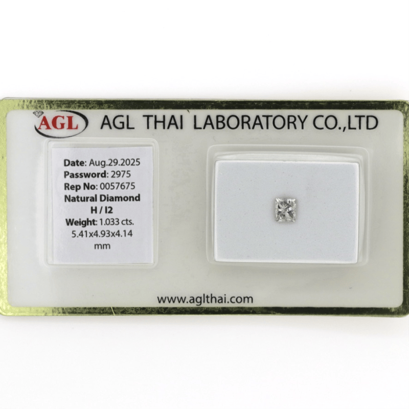 1.033CT CERTIFIED, NATURAL DIAMOND Princess Cut, H Colour, I2 Clarity, Loose, Unset. Stone Comes Sealed With Agl Report: 0057675. Valuations Provided by an Independent Third-Party Professional Not Directly Associated With Lloyds Auctions at AUD $$10,500.00This valuation has been conducted by an independent third-party professional. The valuation amount is an assessment by the issuing valuer and does not reflect the auction value of the item. Any inquiries regarding the valuation should be directed to the issuing valuer (refer to contact details on the certificate), as Lloyds Auctions has no affiliation or influence over the valuation, the valuer, or the stated amount. Condition: Good - Refer Images 0645958+2020