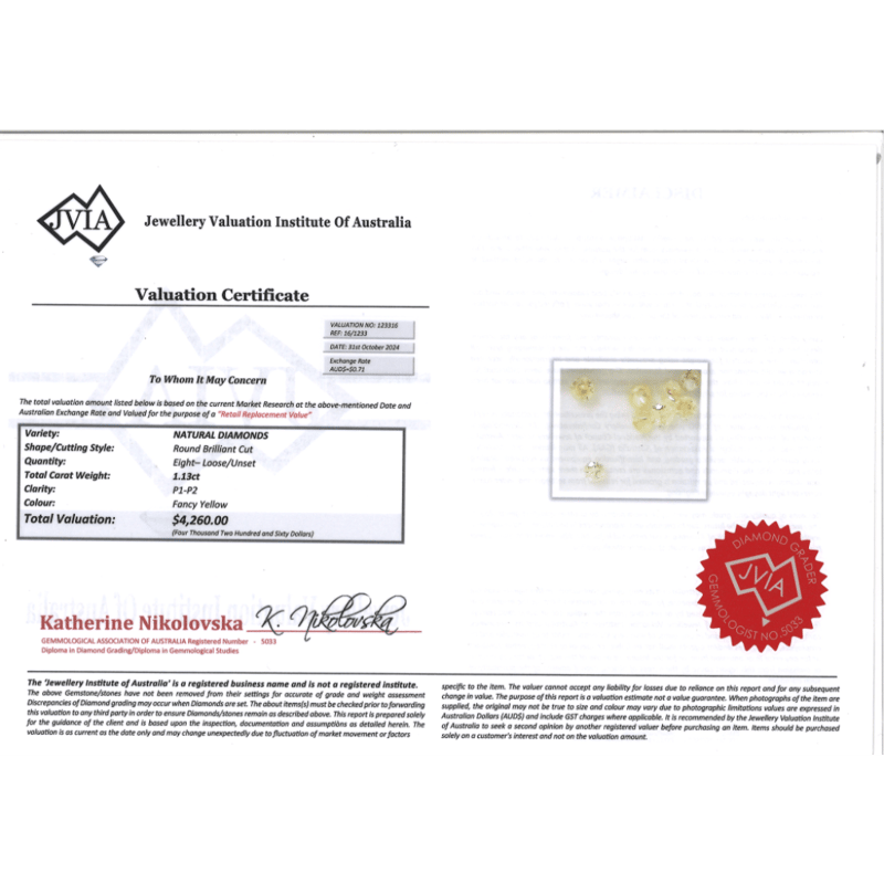 1.13CT TDW X 8, NATURAL FANCY YELLOW DIAMONDS Round Brilliant Cut, P1-P2 Clarity, Loose, Unset. Valuations Provided by an Independent Third-Party Professional Not Directly Associated With Lloyds Auctions at AUD $$4,260.00This valuation has been conducted by an independent third-party professional. The valuation amount is an assessment by the issuing valuer and does not reflect the auction value of the item. Any inquiries regarding the valuation should be directed to the issuing valuer (refer to contact details on the certificate), as Lloyds Auctions has no affiliation or influence over the valuation, the valuer, or the stated amount. Condition: Good - Refer Images 0645958+2024