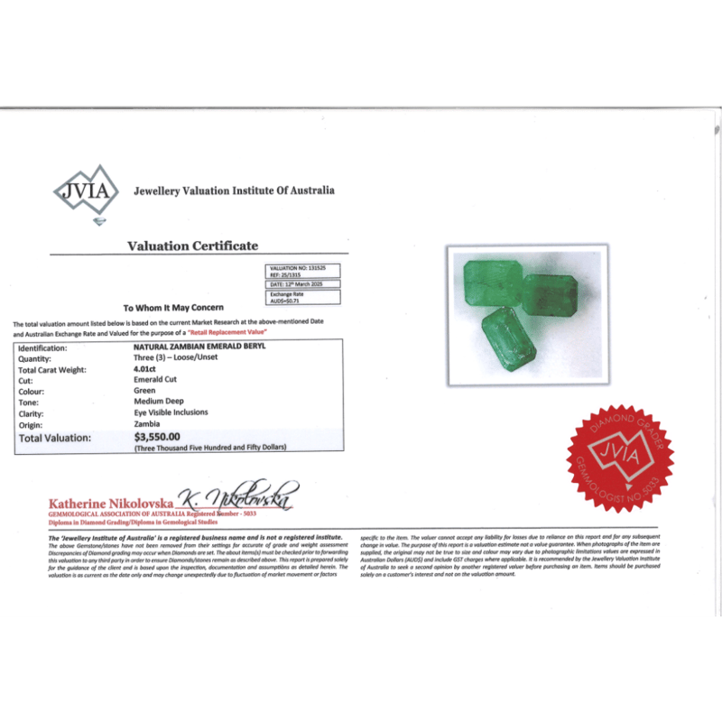 4.01CT TSW X 3 NATURAL ZAMBIAN EMERALD Emerald Cut, Medium Deep Green, Eye Visible Inclusions, Zambian Origin, Loose, Unset. Valuations Provided by an Independent Third-Party Professional Not Directly Associated With Lloyds Auctions at AUD $$3,550.00This valuation has been conducted by an independent third-party professional. The valuation amount is an assessment by the issuing valuer and does not reflect the auction value of the item. Any inquiries regarding the valuation should be directed to the issuing valuer (refer to contact details on the certificate), as Lloyds Auctions has no affiliation or influence over the valuation, the valuer, or the stated amount. Condition: Good - Refer Images 0645958+2027