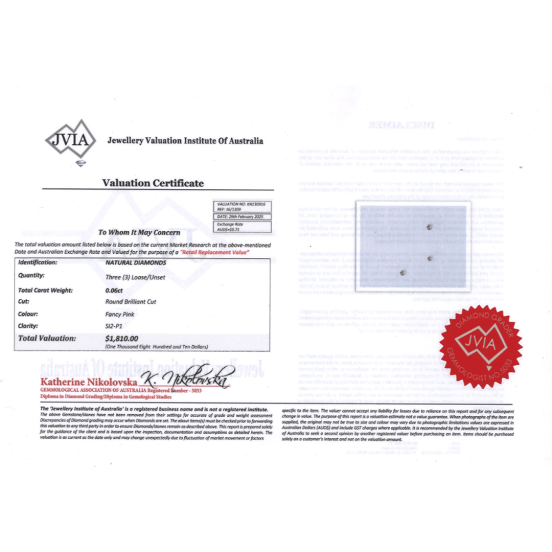 0.06CT TDW X 3, NATURAL FANCY PINK DIAMONDS Round Brilliant Cut, Fancy Pink, Si2-P1 Clarity, Loose, Unset. Valuations Provided by an Independent Third-Party Professional Not Directly Associated With Lloyds Auctions at AUD $$1,810.00This valuation has been conducted by an independent third-party professional. The valuation amount is an assessment by the issuing valuer and does not reflect the auction value of the item. Any inquiries regarding the valuation should be directed to the issuing valuer (refer to contact details on the certificate), as Lloyds Auctions has no affiliation or influence over the valuation, the valuer, or the stated amount. Condition: Good - Refer Images 0645958+2028