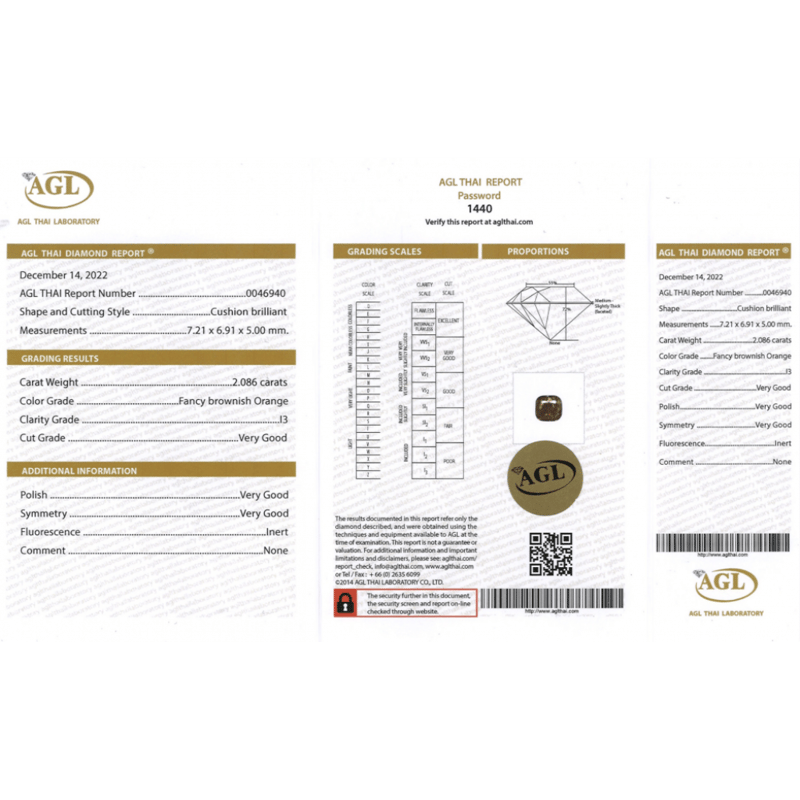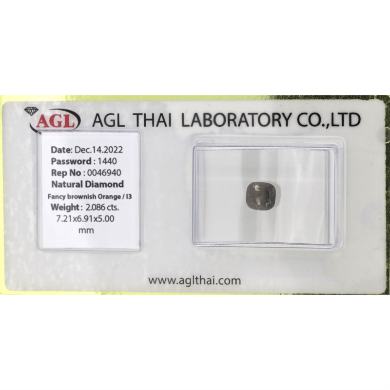 2.086CT CERTIFIED, NATURAL FANCY ORANGE DIAMOND Cushion Brilliant Cut, Fancy Brownish-Orange, I3 Clarity, Loose, Unset. Stone Comes Sealed With Agl Report: 0046940. Valuations Provided by an Independent Third-Party Professional Not Directly Associated With Lloyds Auctions at AUD $$20,800.00This valuation has been conducted by an independent third-party professional. The valuation amount is an assessment by the issuing valuer and does not reflect the auction value of the item. Any inquiries regarding the valuation should be directed to the issuing valuer (refer to contact details on the certificate), as Lloyds Auctions has no affiliation or influence over the valuation, the valuer, or the stated amount. Condition: Good - Refer Images 0645958+2042