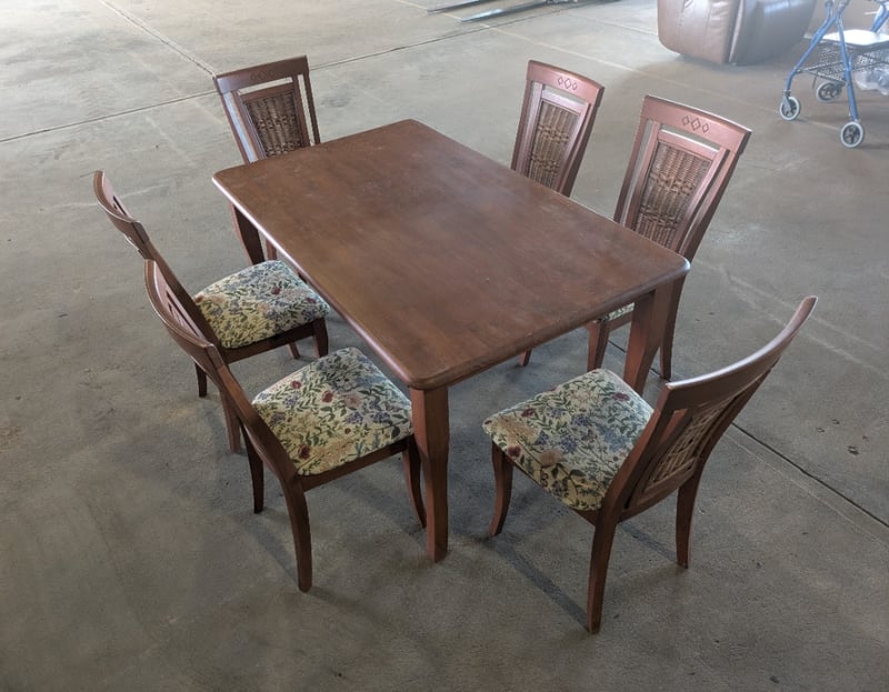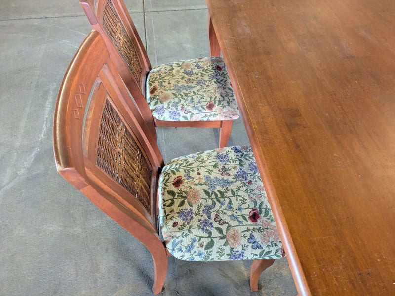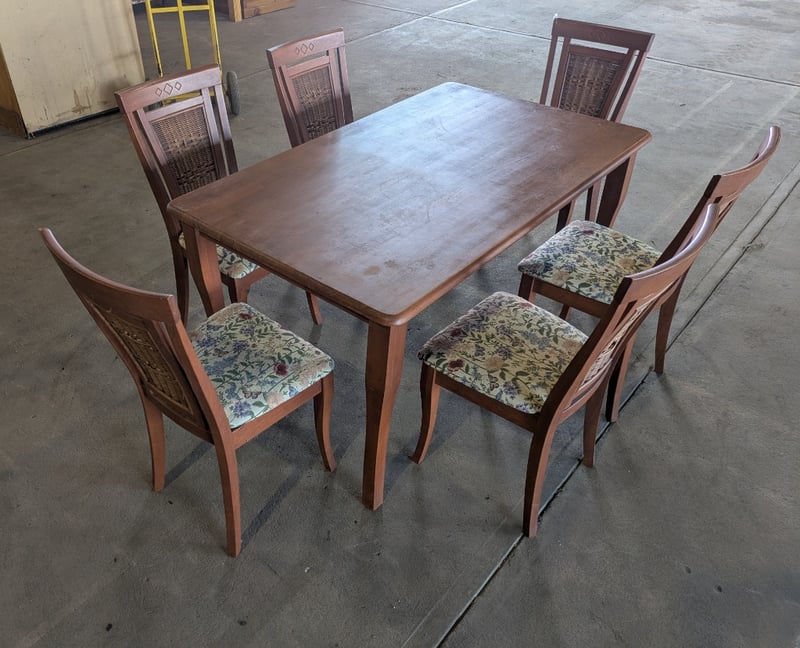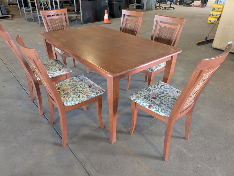 Wooden Dining Table with 6 Upholstered Chairs. Used Condition. Table is 74cm tall, 179cm long and 90cm wide. Sold as Lot.