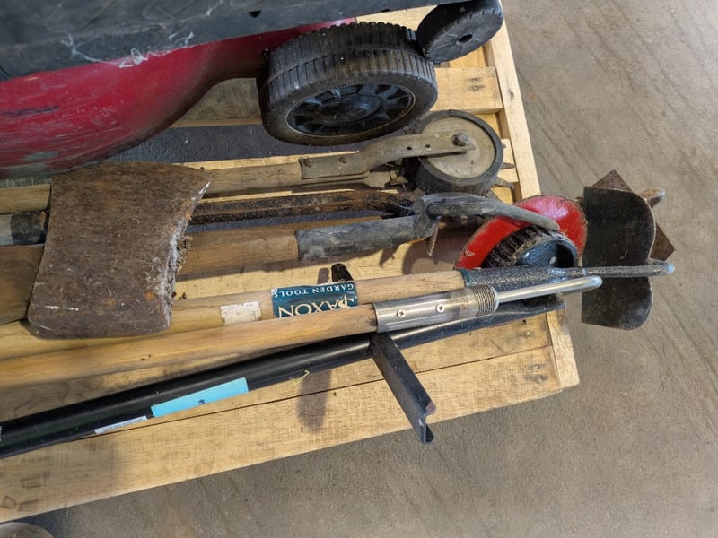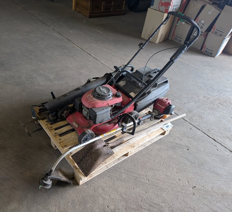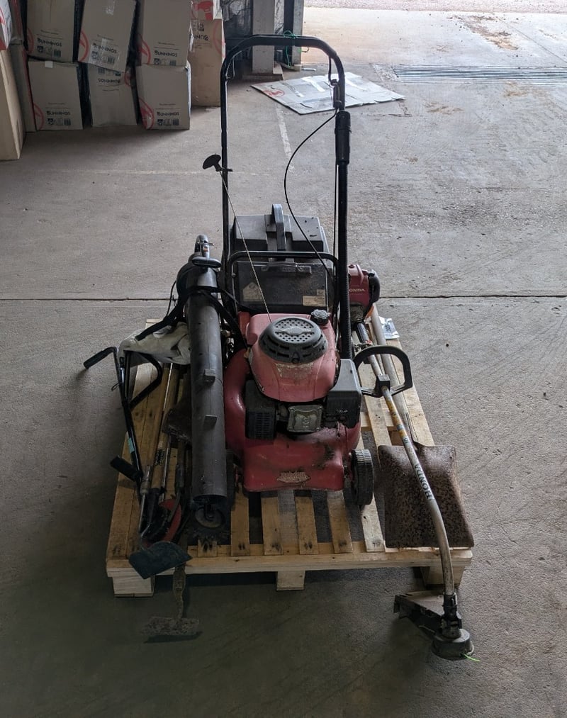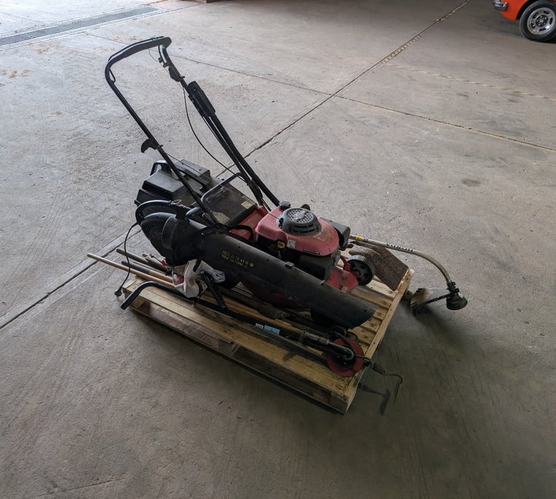 Pallet With Various Gardening and Lawn Care Items Including Lawn Mower, Powered Blower and Vacuum, Weed Trimmer and more.. Unknown Working Order. Used Condition. Inspection Advised. Sold as Lot.