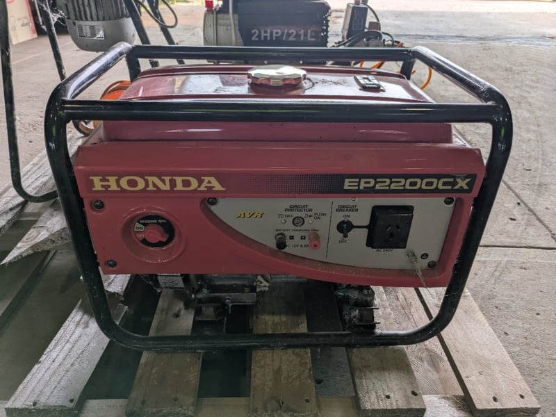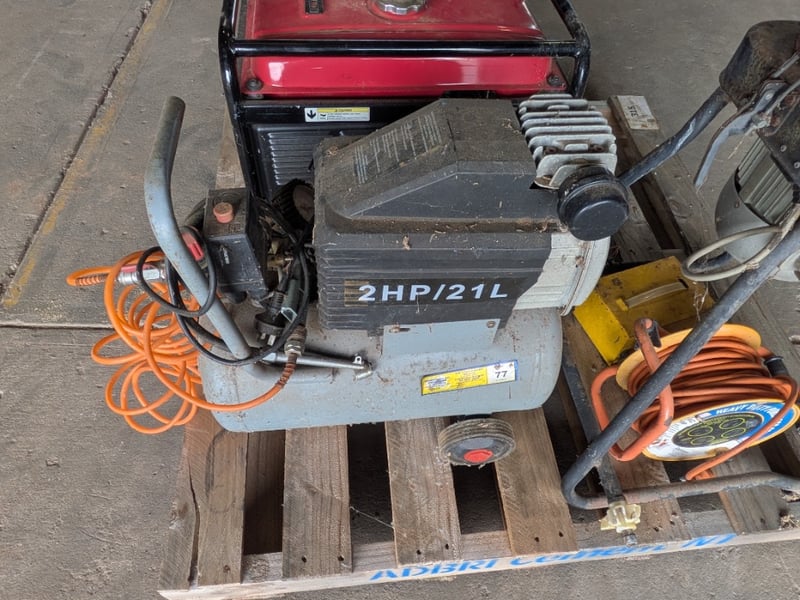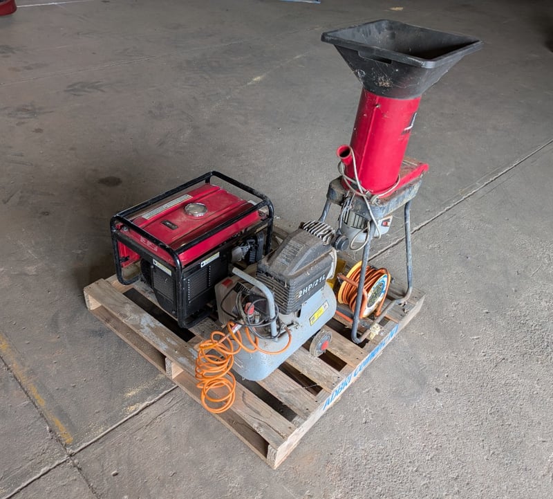 Pallet with Various Equipment including Honda EP2200CX Generator Series NO. 1223177, 2HP Air Compressor unknown Serial NO. and more. Unknown Working Order, Used Condition. Inspection Advised. Sold as Lot.