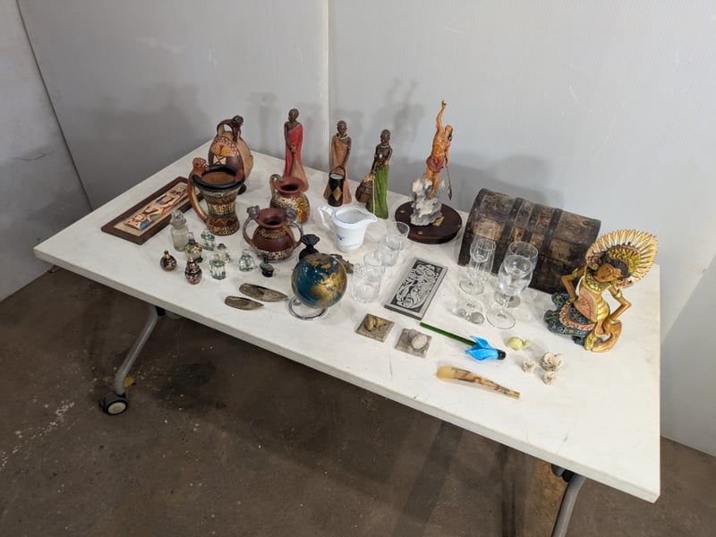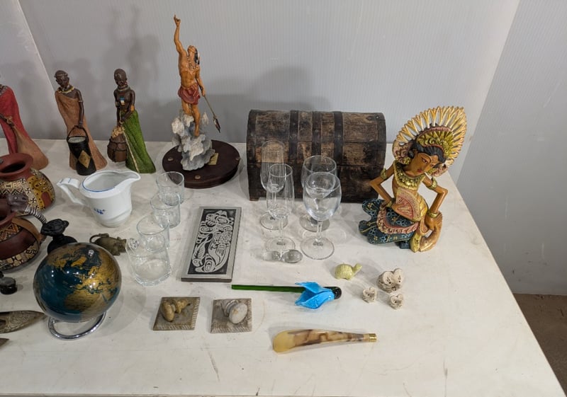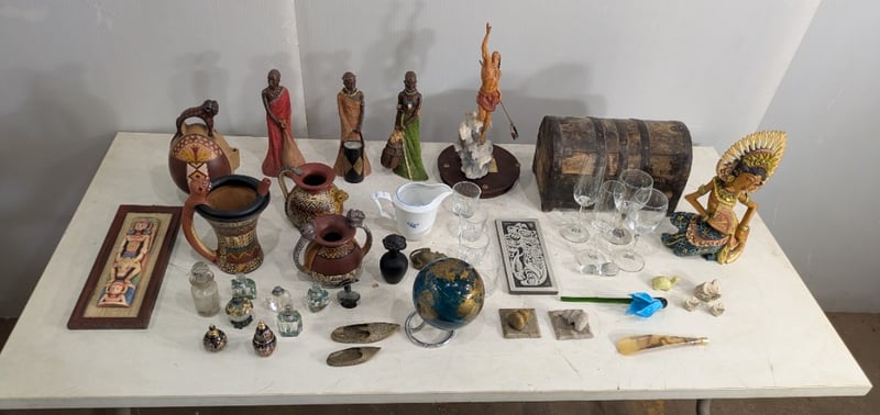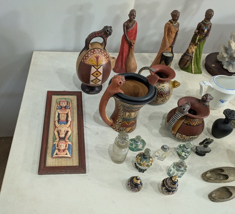 Box with Various Small Statues, Empty Perfume Collectables and More. Sold as Lot.