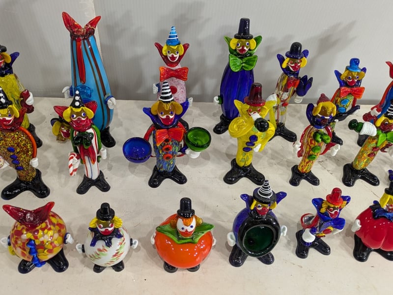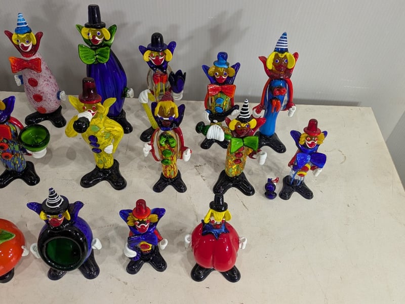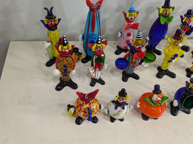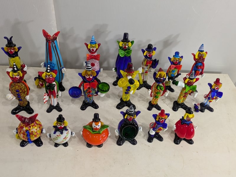 Hand Blown Murano Glass Clown Figurines (2 Boxes). 20 in Total. Damage to Some. Sold as Lot