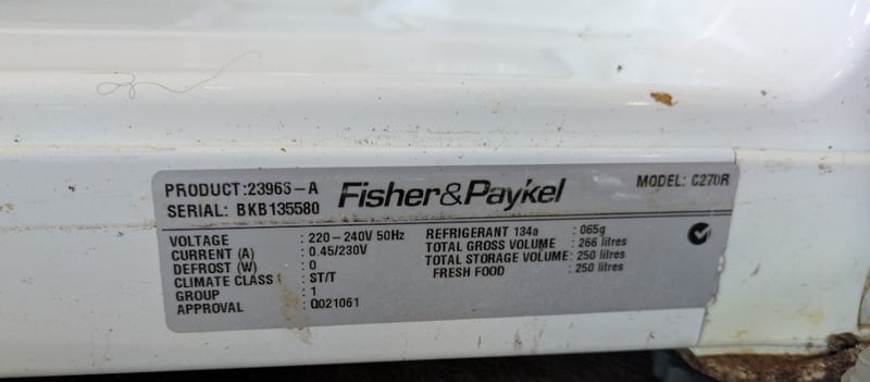 Mid Sized Fisher & Paykel Refrigerator Serial NO. BKB135580. Used Condition. Inspection Advised.