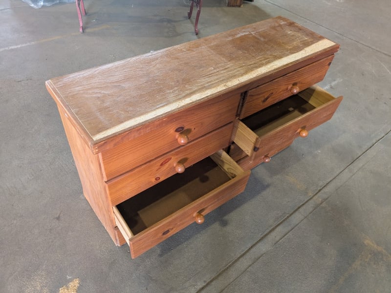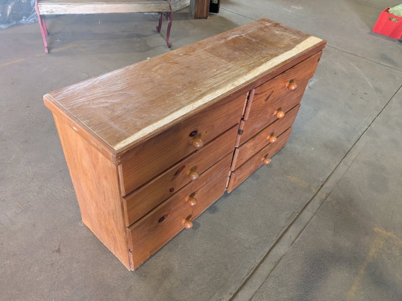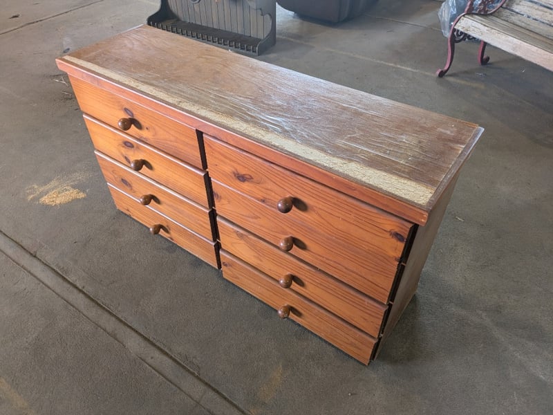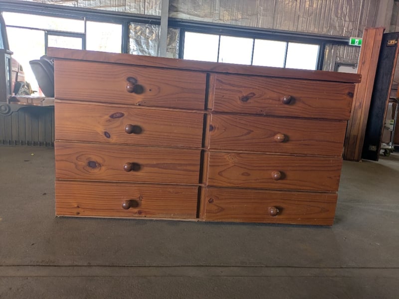 Timber Chest of Drawers (Tallboy) with 8 Drawers. Used Condition. 142cm long, 80cm tall.