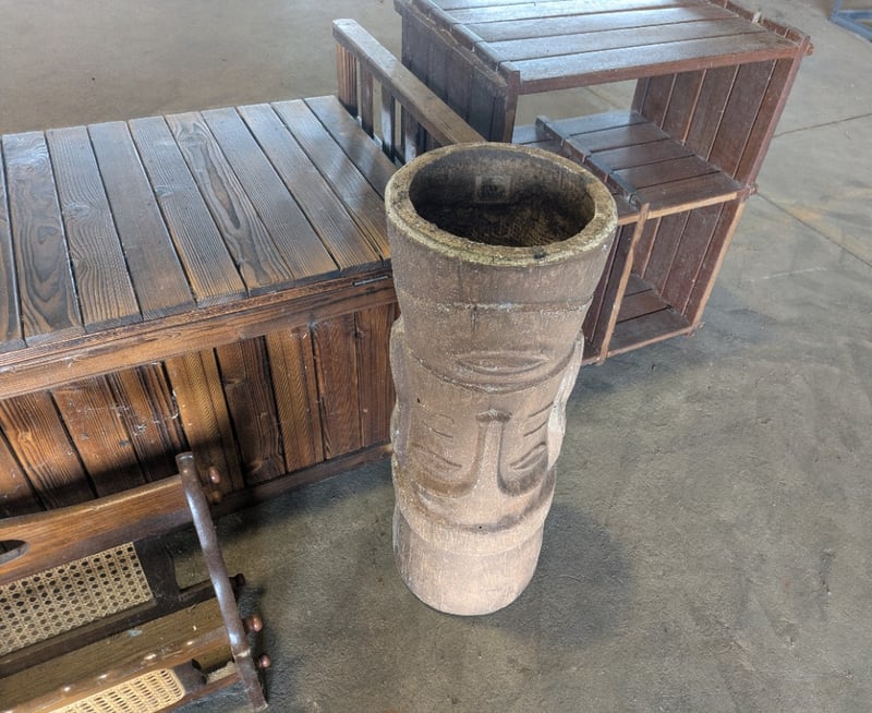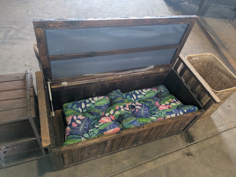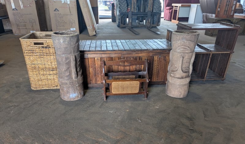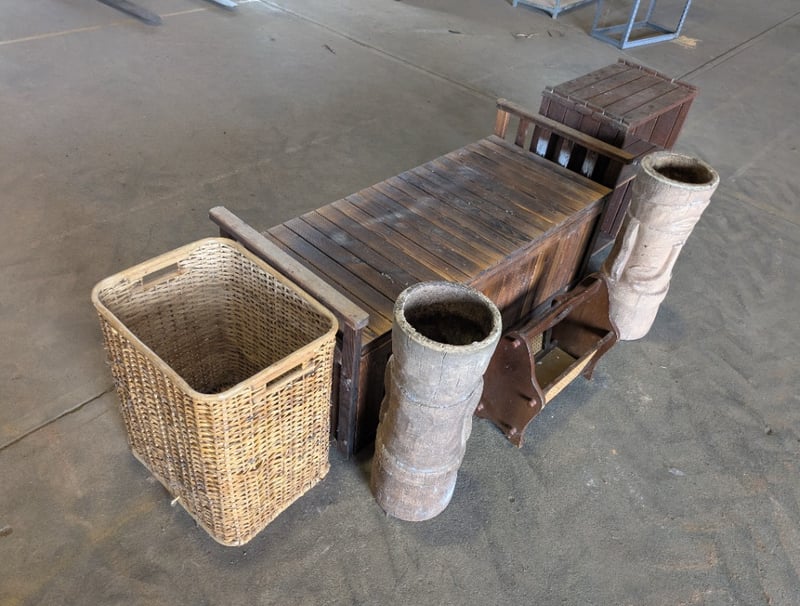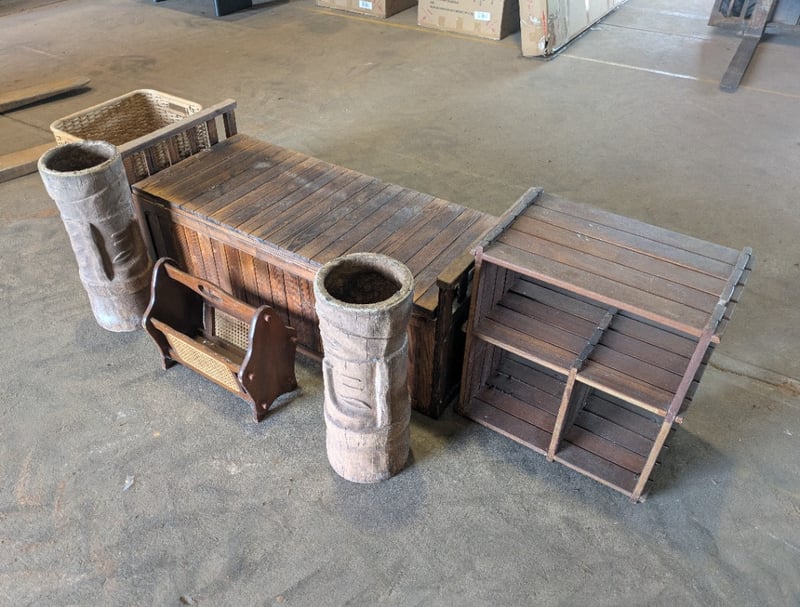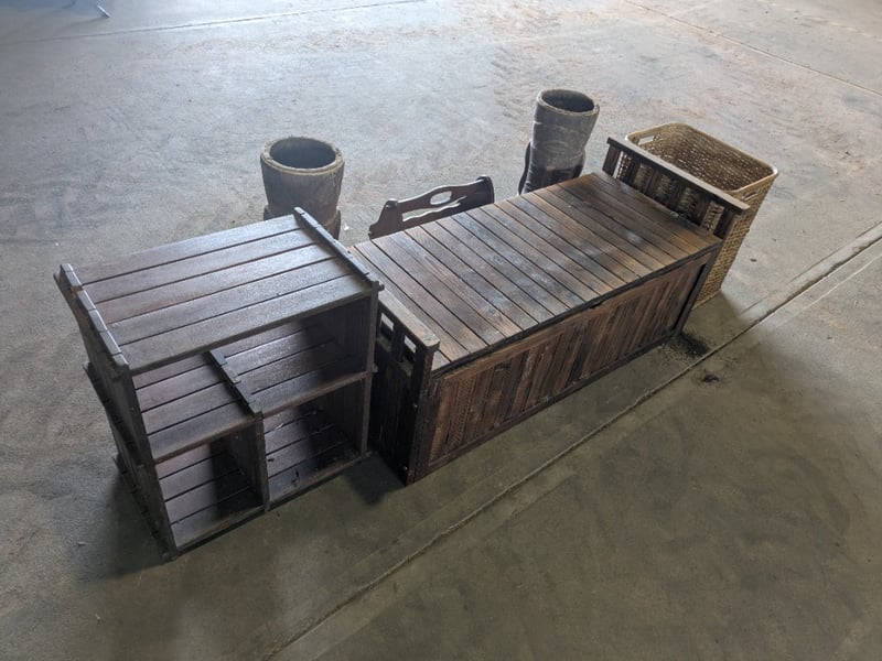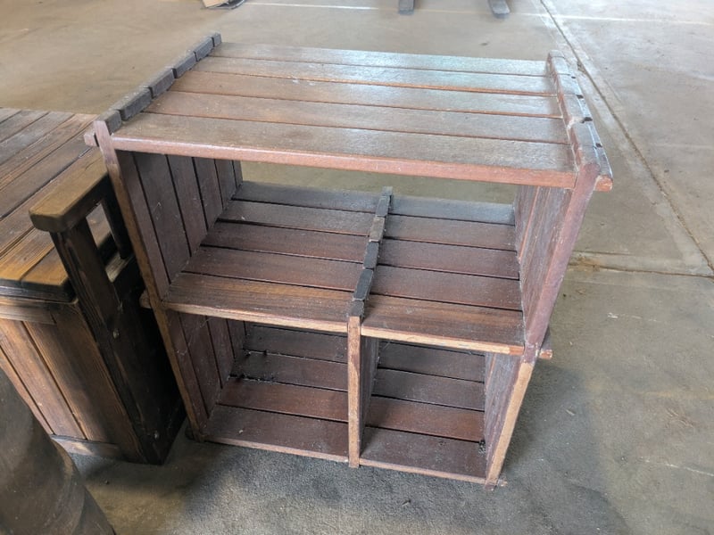 Various Pieces of Wooden Outdoor Garden Furniture including a Bench, Flower Stands and More. Used Condition. Sold as Lot.