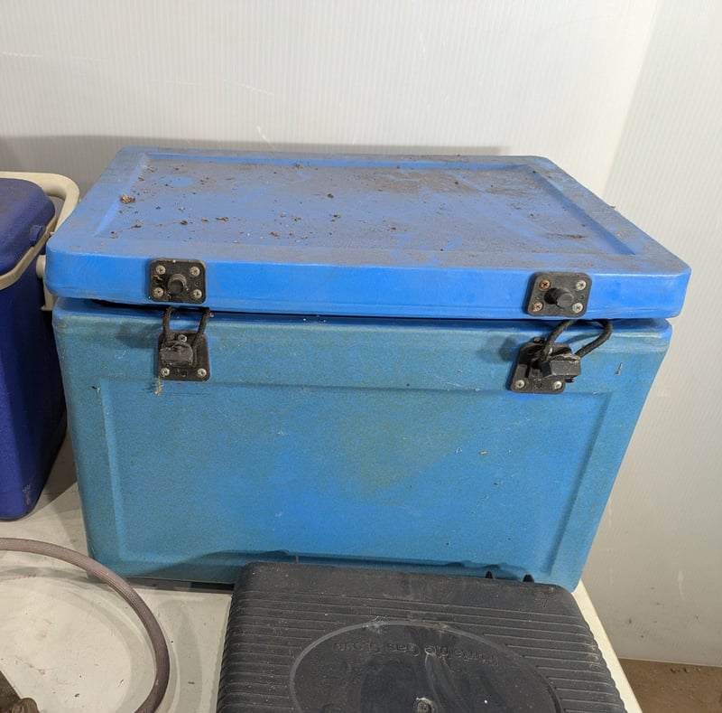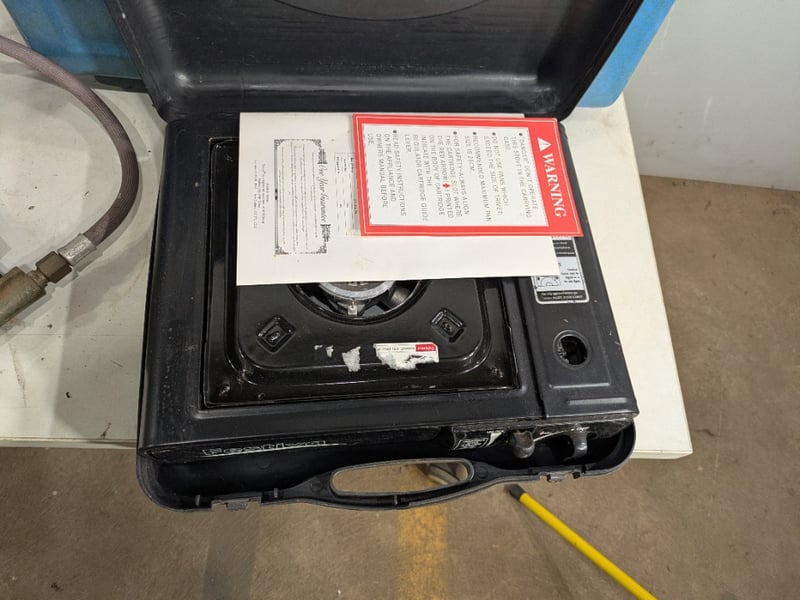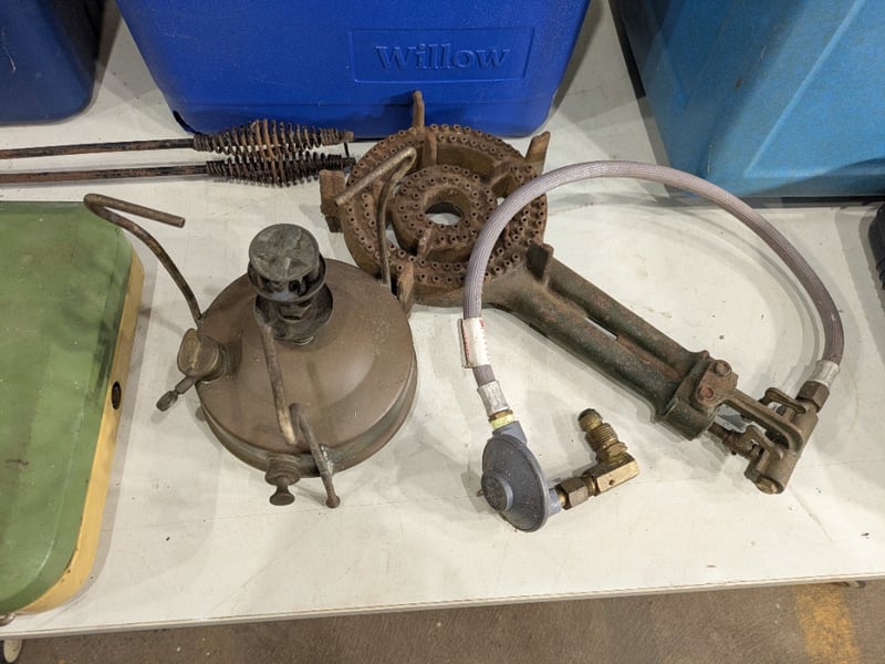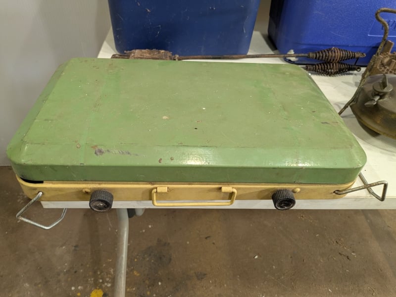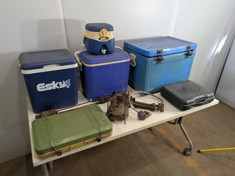 Various Camping Cooking Instruments and Food Storage Pieces including Festival Portable Gas Stove, Willow Esky and More. Used Condition. Sold as Lot.