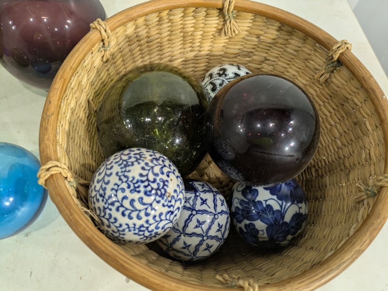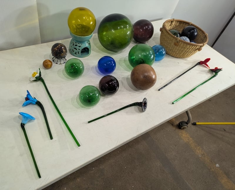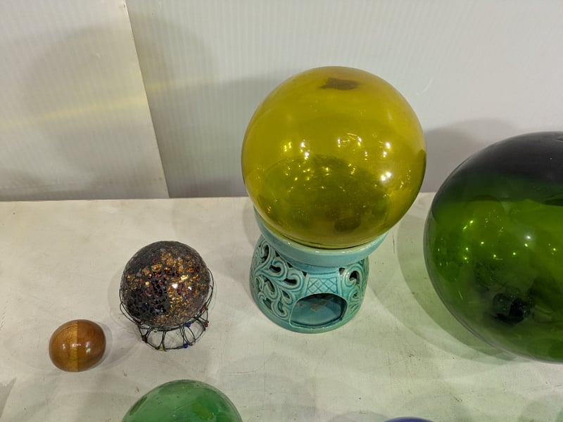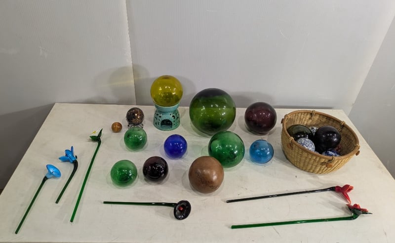 Various Glass Float Balls and Hand-Blown Art Glass Flowers. Sold as Lot.