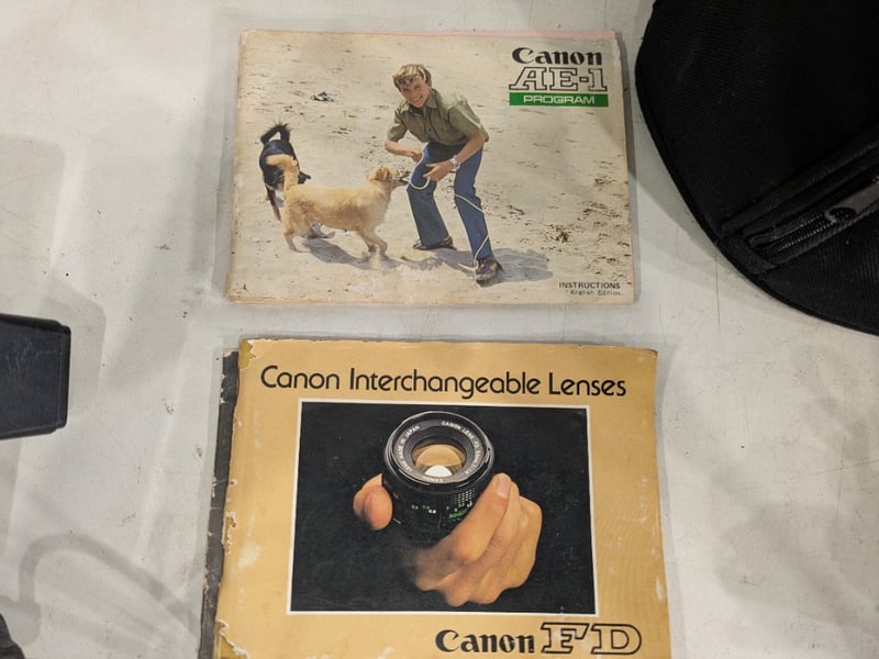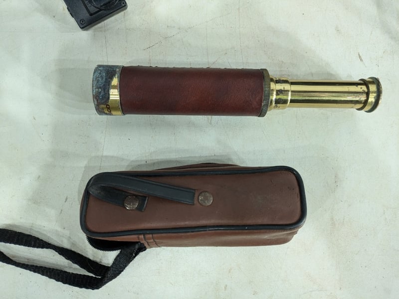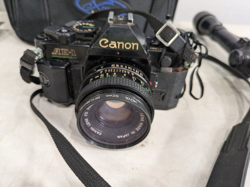 Canon AE-1 Program Camera with Accessories and Various Monoculars/Binoculars. Sold as Lot.