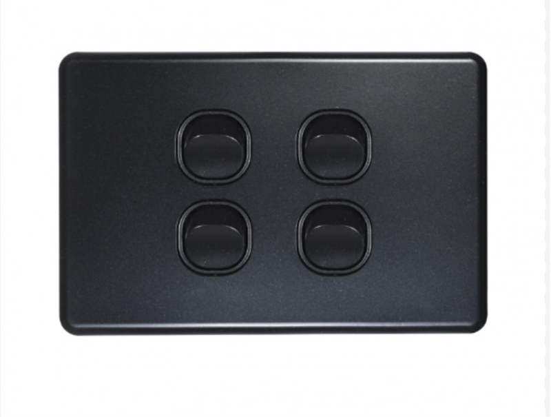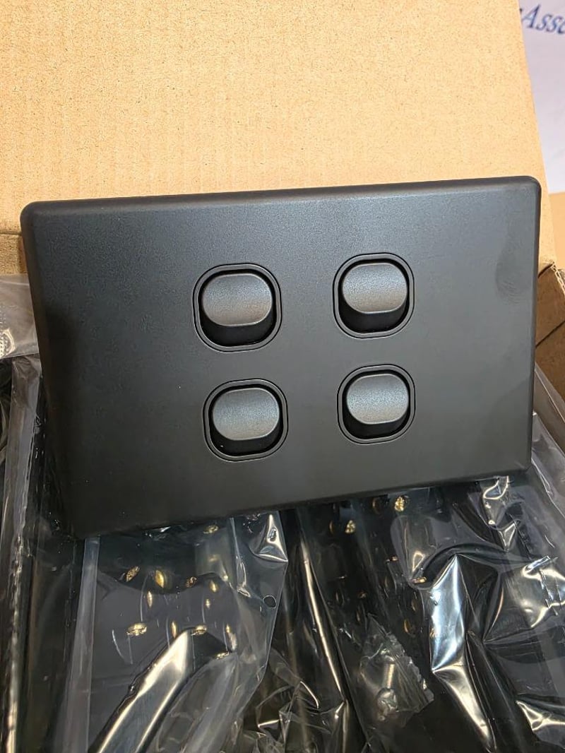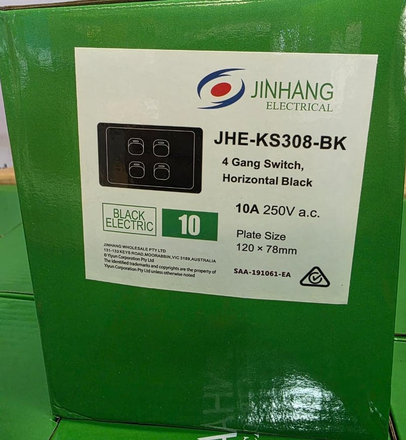 RRP $3300 Combined, 10A 4 Gang Wall Switch Slim BlackQTY: 100pcsMODEL: JHE-KS308-BKPRODUCT DIMENSIONS: 120mm x 78mm